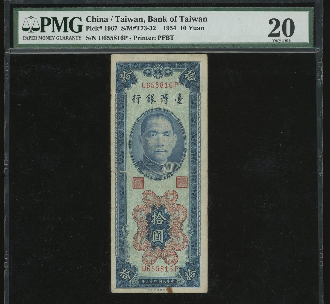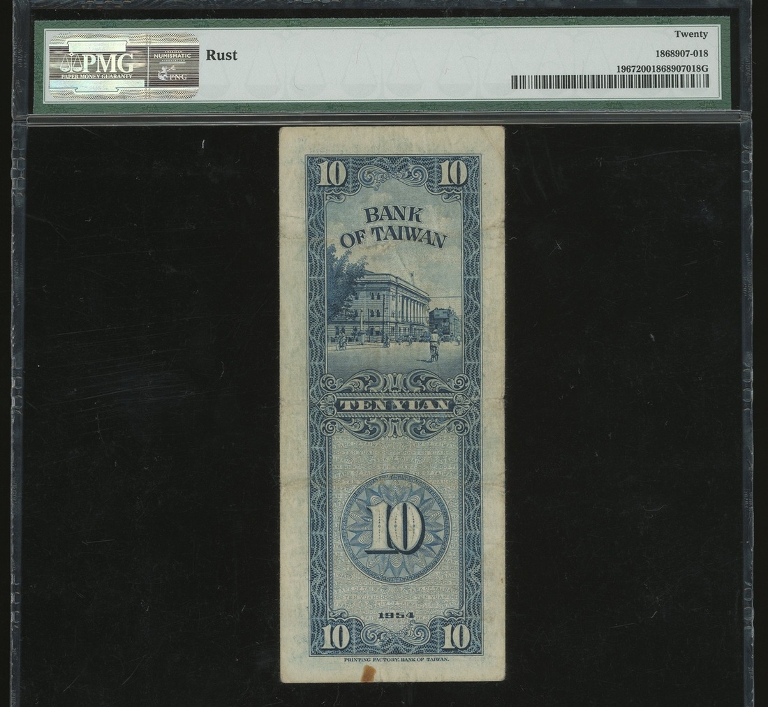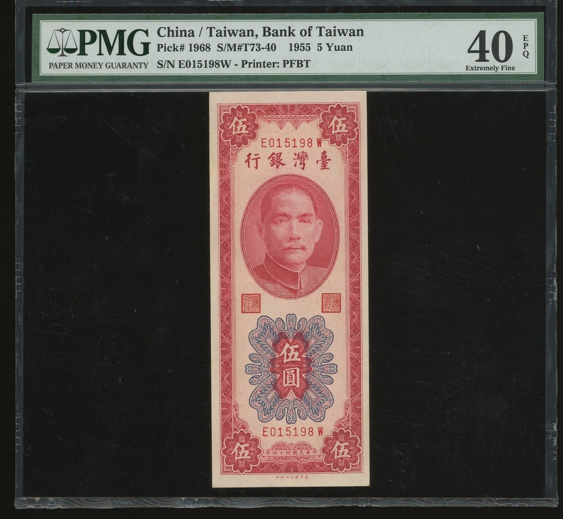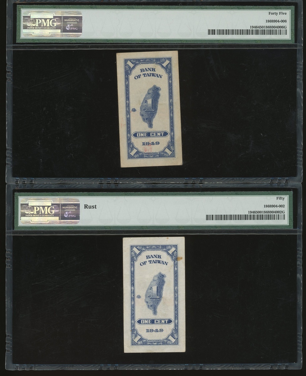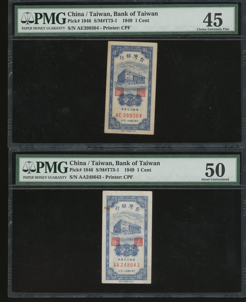 Bank of Taiwan, a group of 4x notes, consists of a pair of 1 cent, Year 38(1949), 5 yuan, Year 44(1955) and 10 yuan, Year 43(1954), serial numbers AA248643, AE 399304, E015198W and U655816P, (Pick 1946, 1967 and 1968), graded PMG 50(Rust), 45, 40EPQ and 20(Rust) respectively (4).