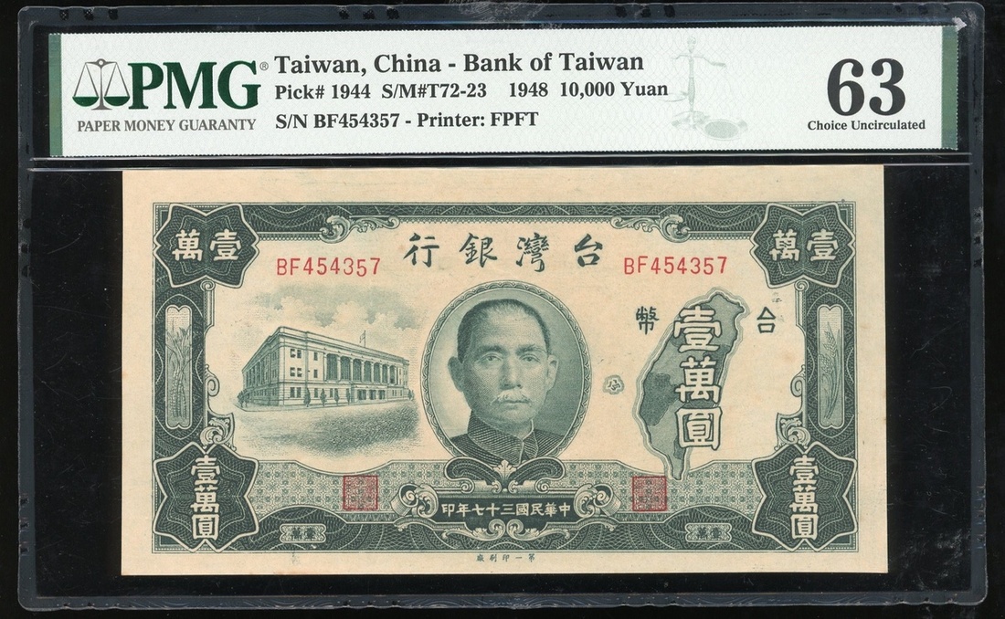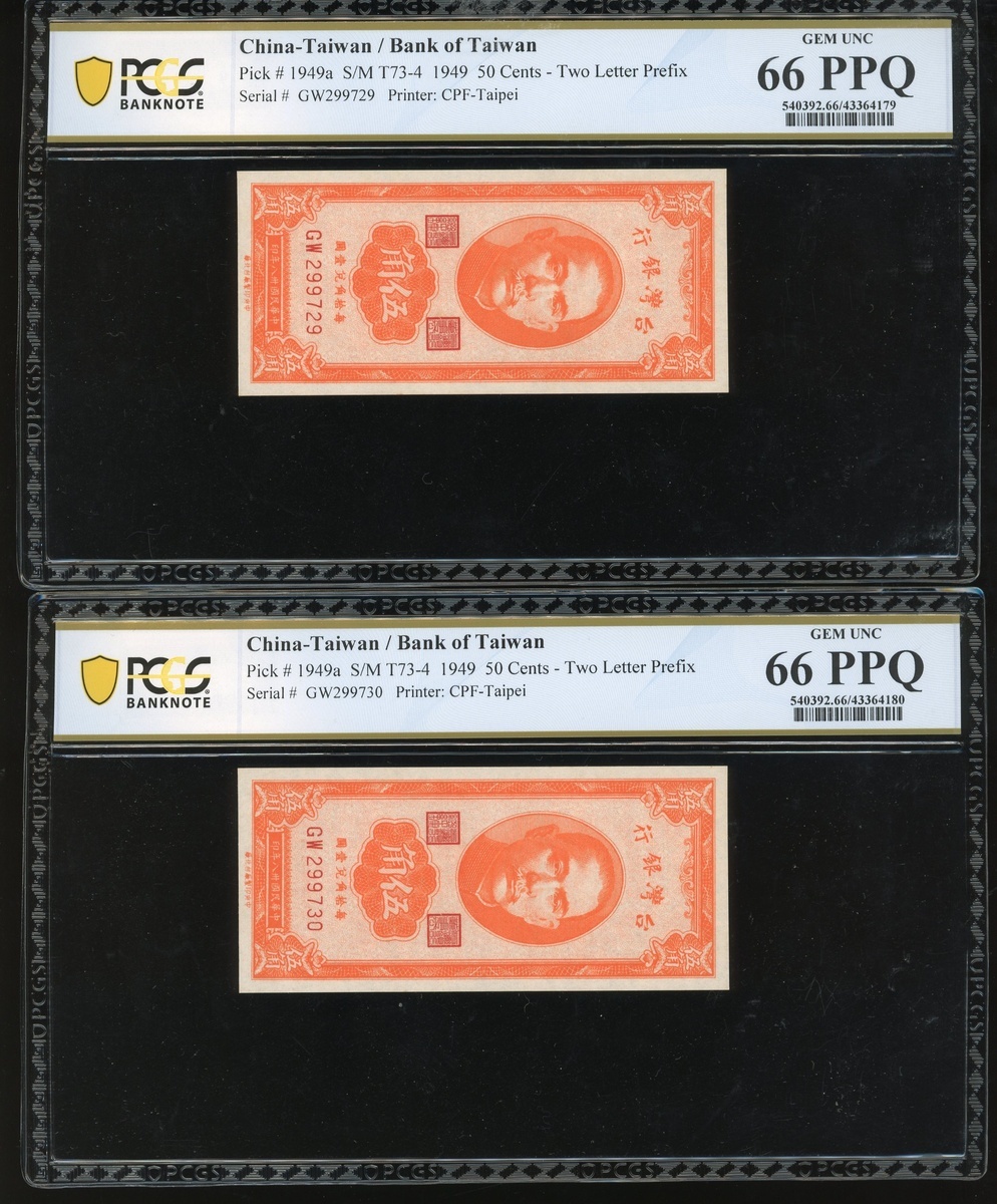 1949年臺灣銀行一組3枚,1949年5毫連號2枚,雙字母編號GW299729-30,及1948年壹萬元,編號BF454357,5毫評PCGS Banknote 66PPQ,10000元PMG 6