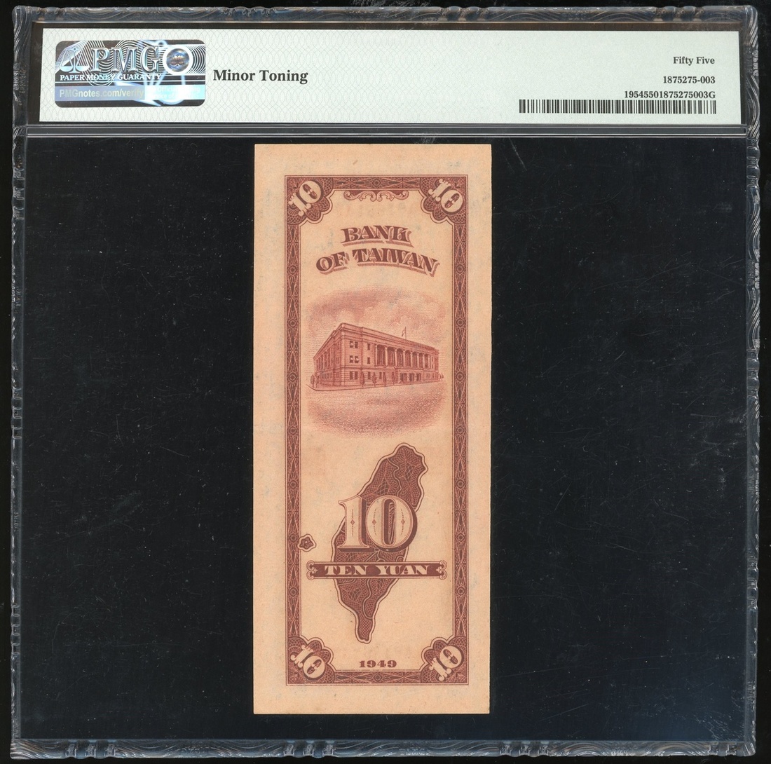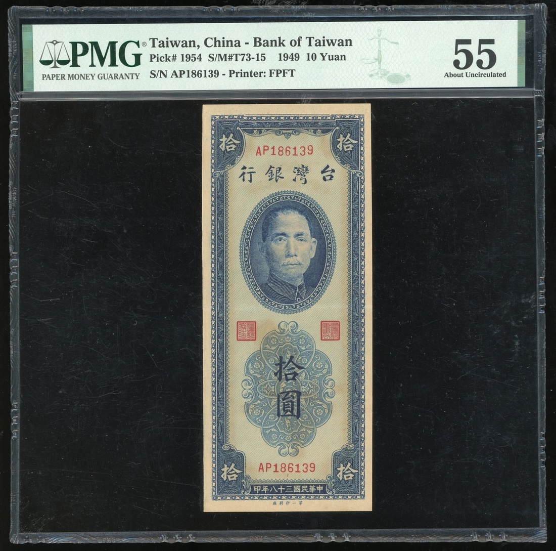 1949年臺灣銀行10元,第一廠版,編號AP186139,PMG 55,微黃