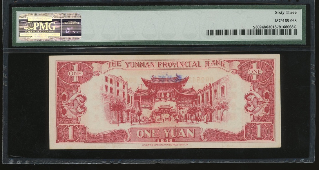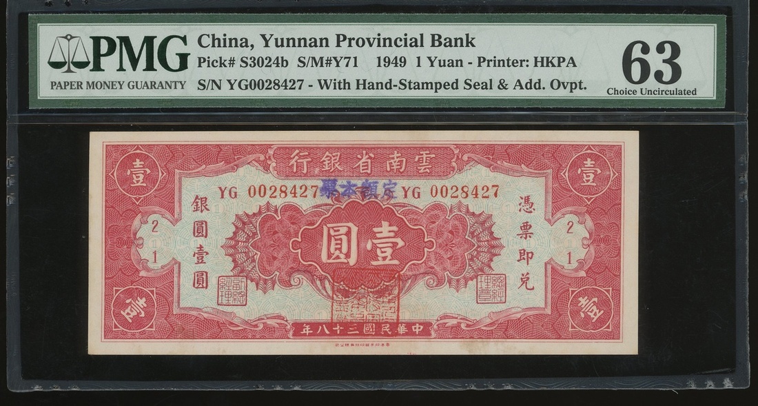 Yunnan Provincial Bank, 1 yuan, Year 38(1949), serial number YG0028427, (Pick S3024b), PMG 63 Choice Uncirculated.