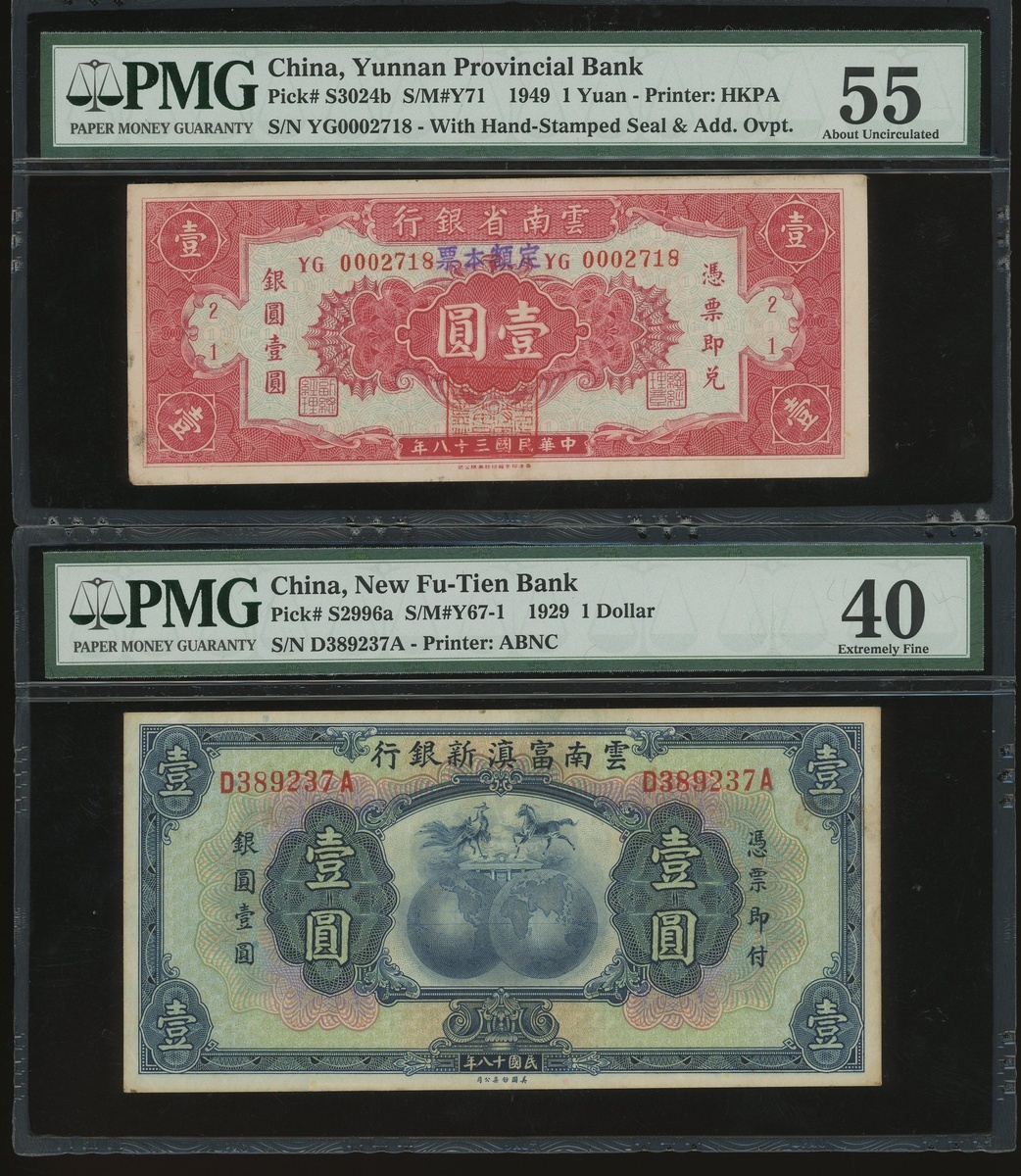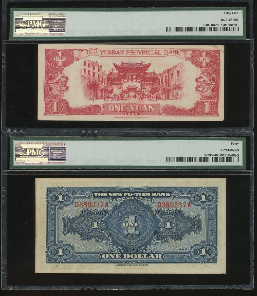 Yunnan Provincial Bank, 1 yuan, Year 38(1949), also New Fu-Tien Bank, $1, Year 18(1929), serial numbers YG0002718 and D389237A, (Pick S3024b and S2996a), graded PMG 55 and 40 respectively (2).