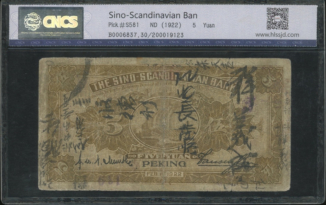 Sino-Scandinavian Bank, 5 yuan, Peiking, ND(1922), serial number B0006837, (Pick S581), encapsulated by a third party grading company CNCS, graded 30, sold as is no returns .