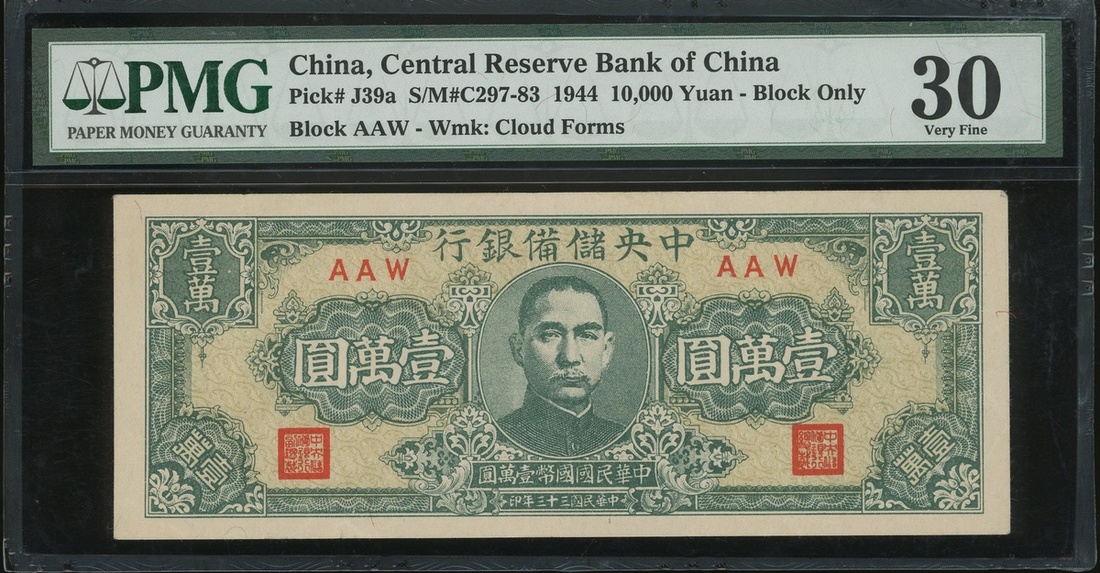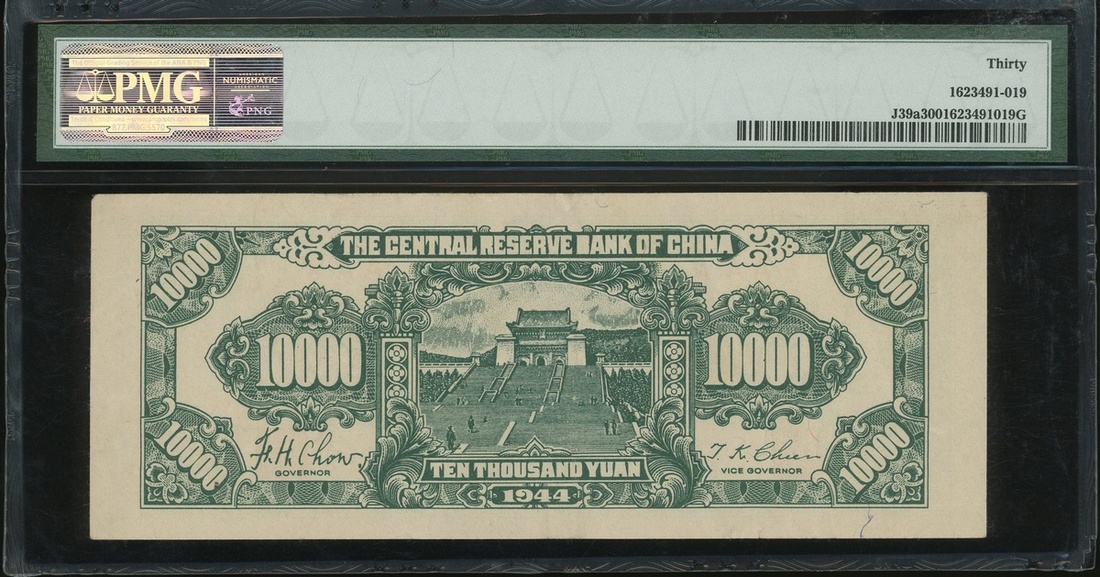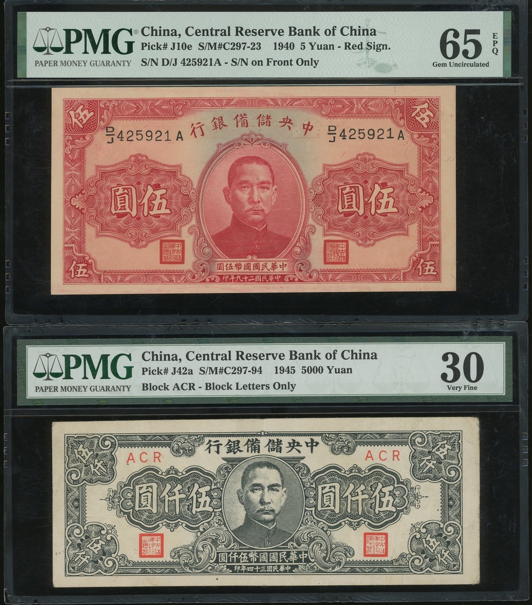 The Central Reserve Bank of China, 5 Yuan, 1940, 5000 Yuan, 1944 and 10000 Yuan, 1945, serial number D/J 425921 A, ACR and AAW, (Pick J10e, J42a, J39a), graded PMG 65EPQ, 30 and 30 respectively (3).