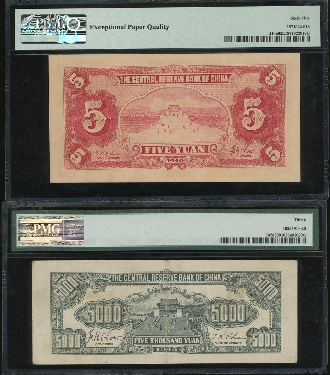 1940至1945年中央儲備銀行5元、5000元、壹萬元一組3枚,編號D/J 425921 A、ACR-AAW, 均PMG30-65EPQ(3)