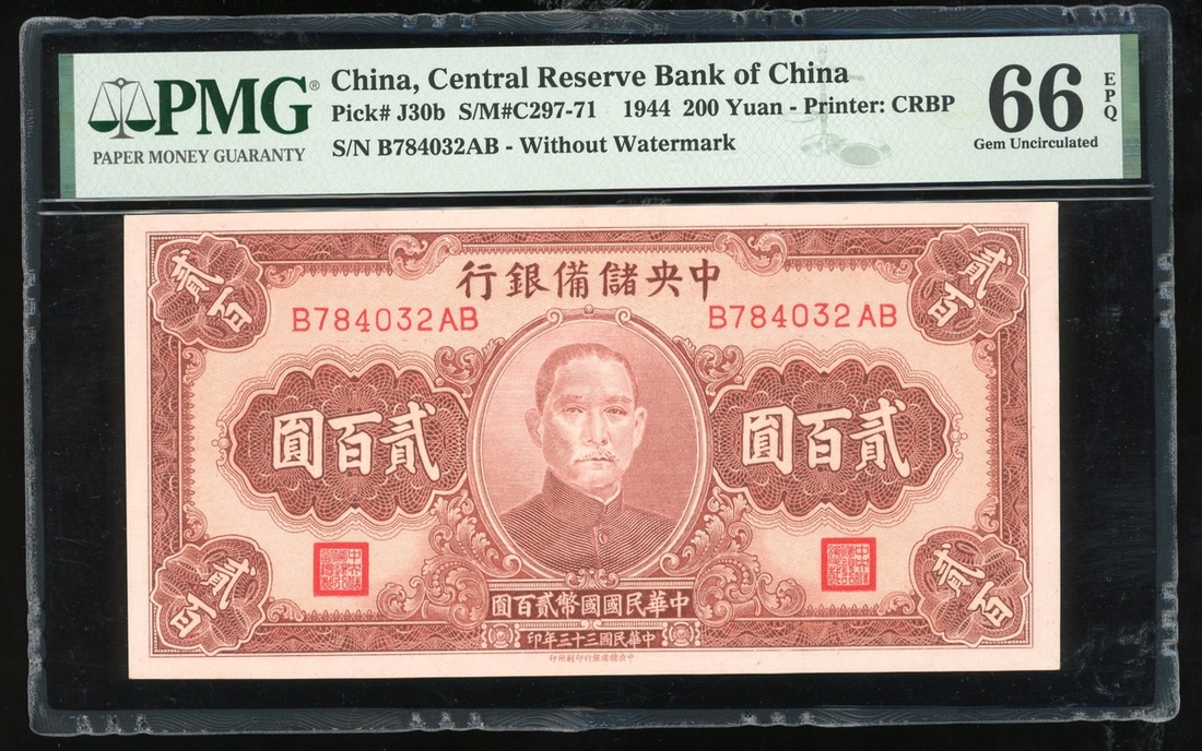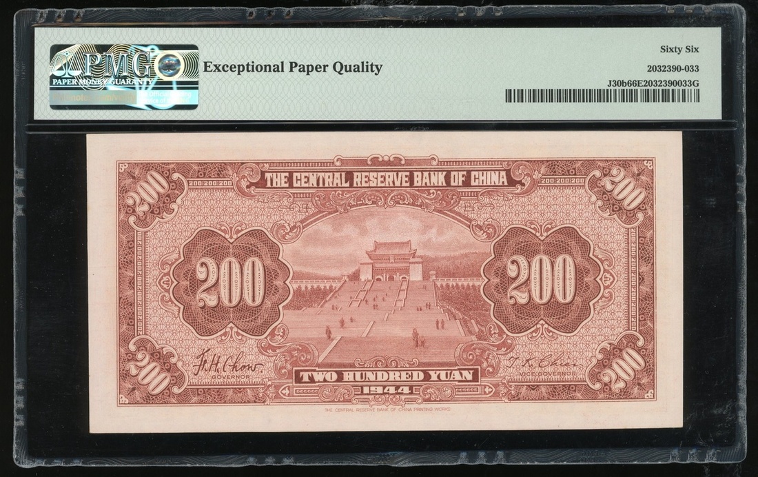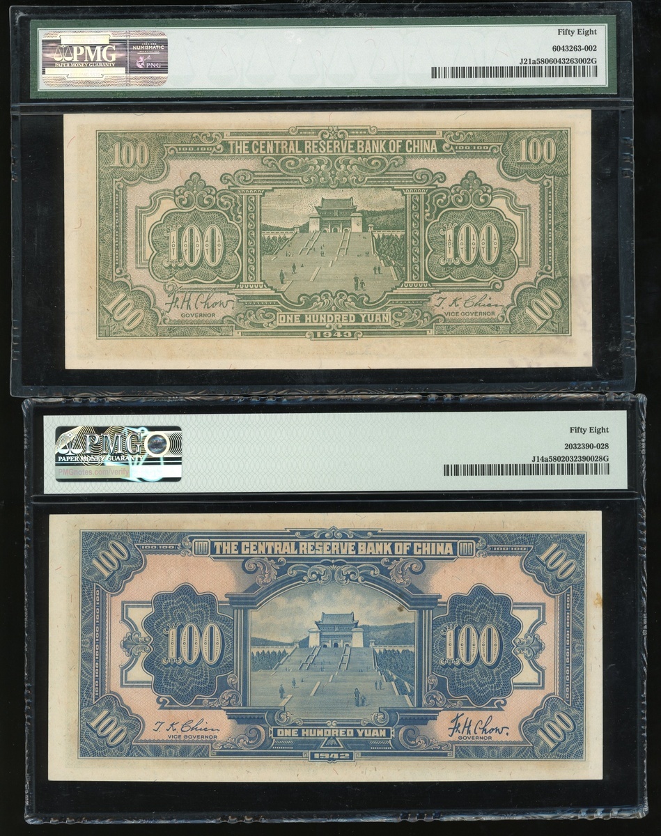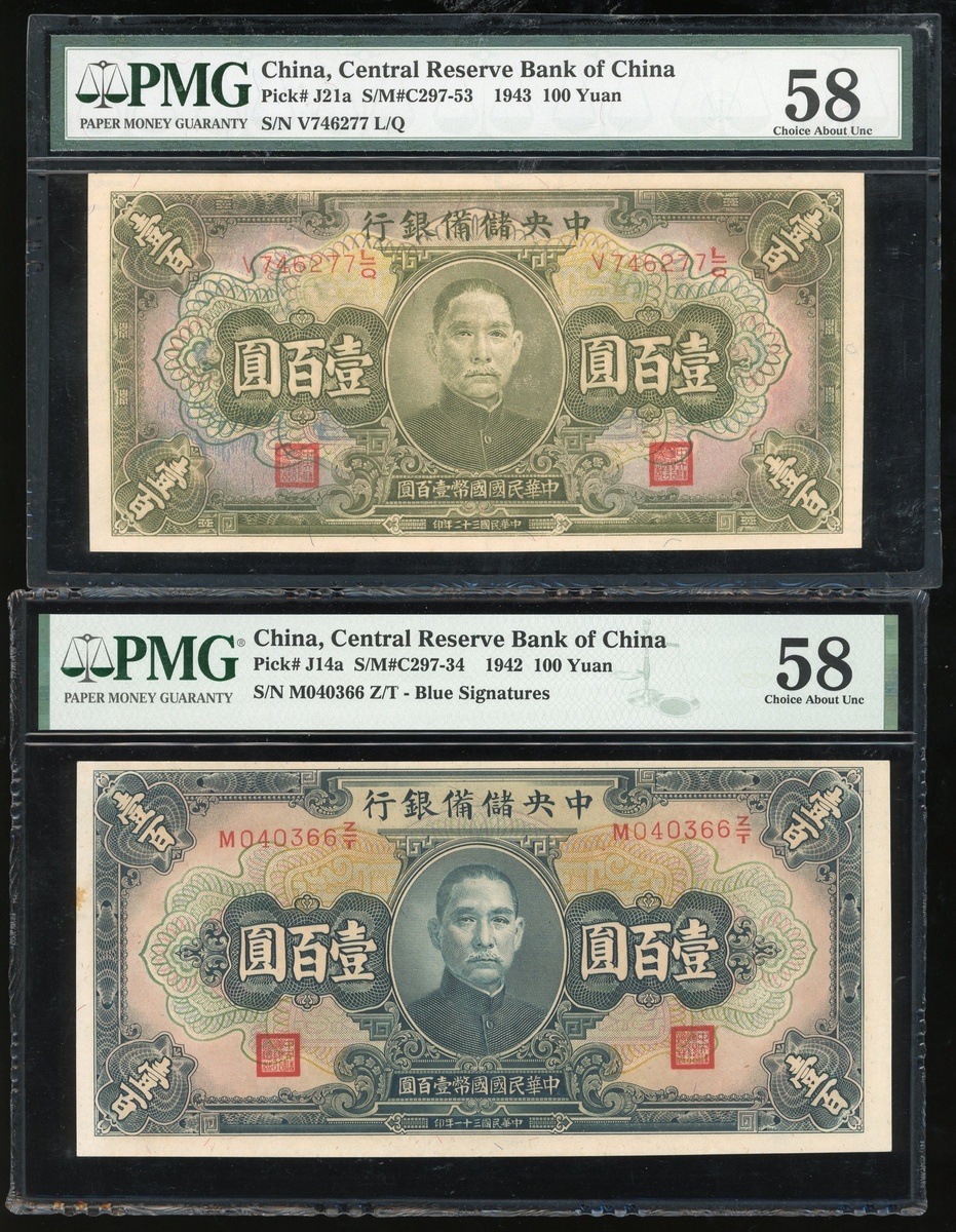 Federal Reserve Bank of China, a group of 3x notes, consists of 100 yuan (1942 and 1943), and 200 yuan, 1944, serial numbers M040366 Z/T, V746277 L/Q and B784032AB, (Pick J14a, J21a and J30b), graded PMG 58 , 58 and 66EPQ respectively (3),