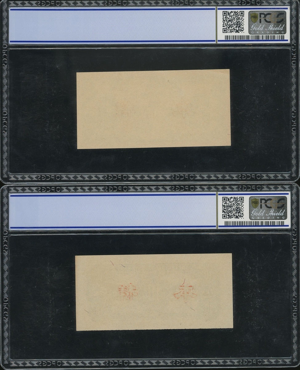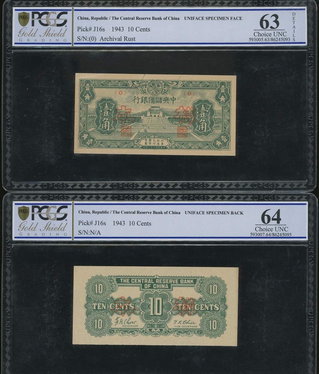 The Central Reserve Bank of China, a pair of uniface obverse and reverse 10 cents specimen, 1943, (Pick J16s), the front graded PCGS Gold Shield 63 Choice Uncirculated (Archival Rust), the reverse 64 Choice Uncirculated (1 pair).