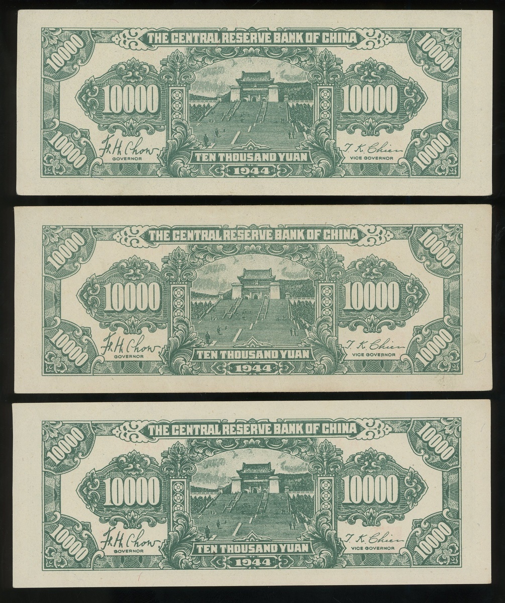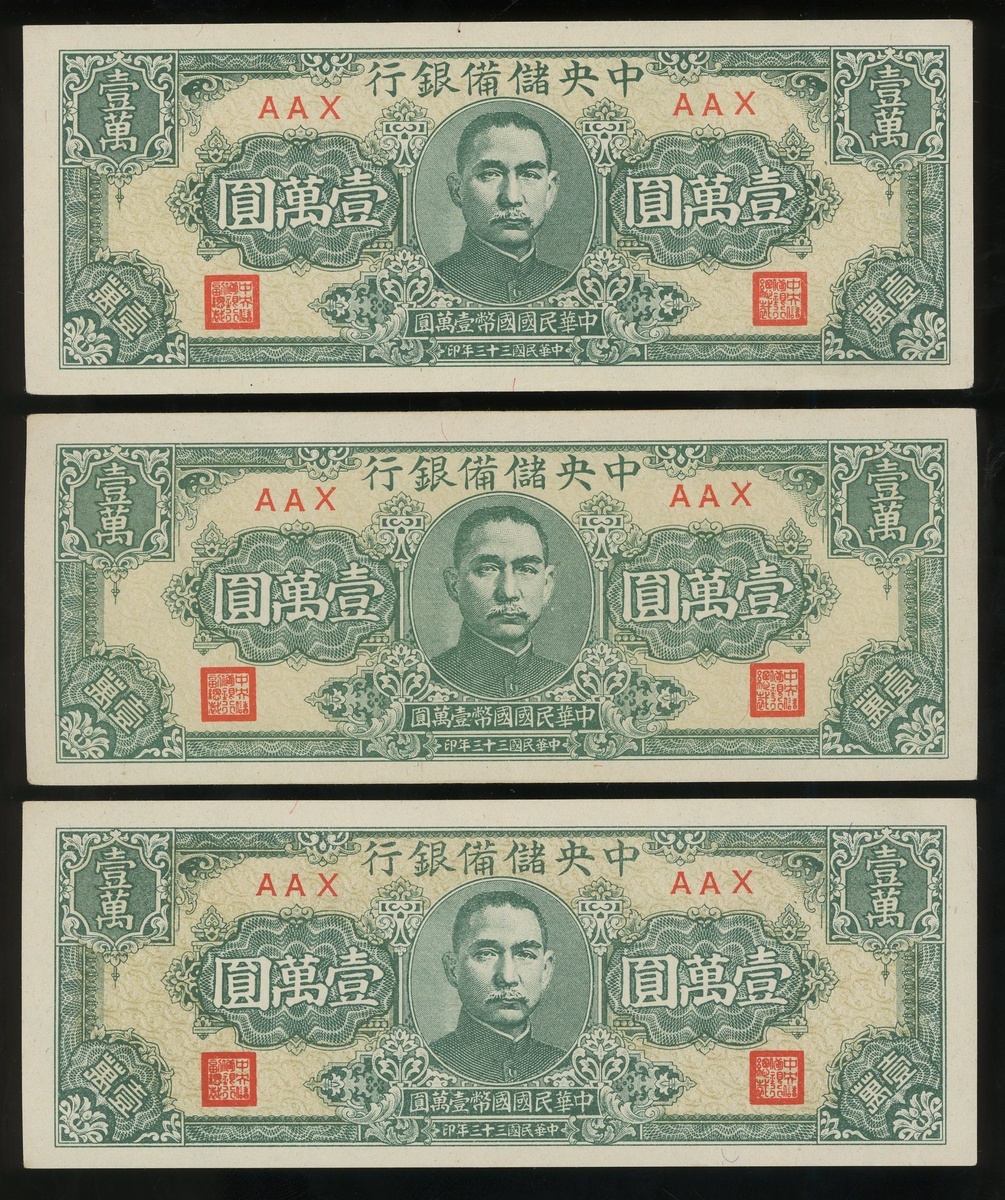 1944年中央儲備銀行壹萬元一組3枚,同組號AAX,EF品相