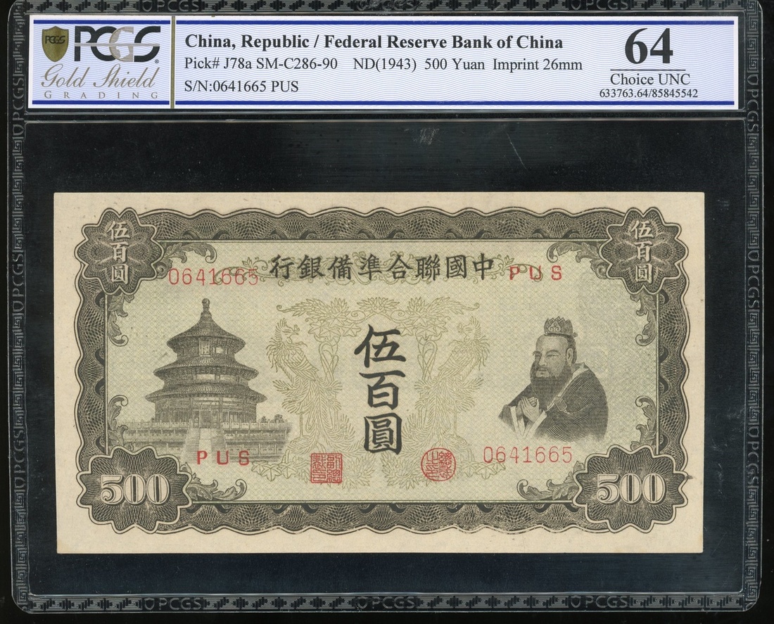 1943年中國聯合準備銀行500元,編號0641665 PUS,PCGS Gold Shield Grading 64