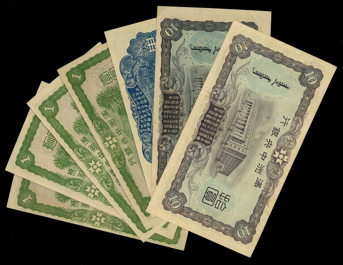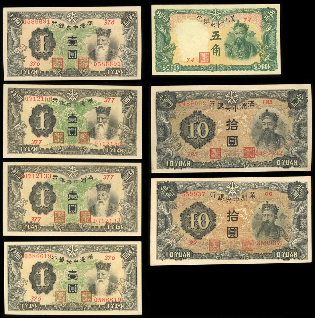Central Bank of Manchukuo, group of 7 notes from the issue of 1935-1938, consisting of: 5 jiao, 1 yuan (4) and 10 yuan (2) with a 6 digit and 7 digit serial numbers, (Pick J129, J130b, J132a and 132b), the 6 digit 10 yuan good very fine and the other almost uncirculated to uncirculated (7)
