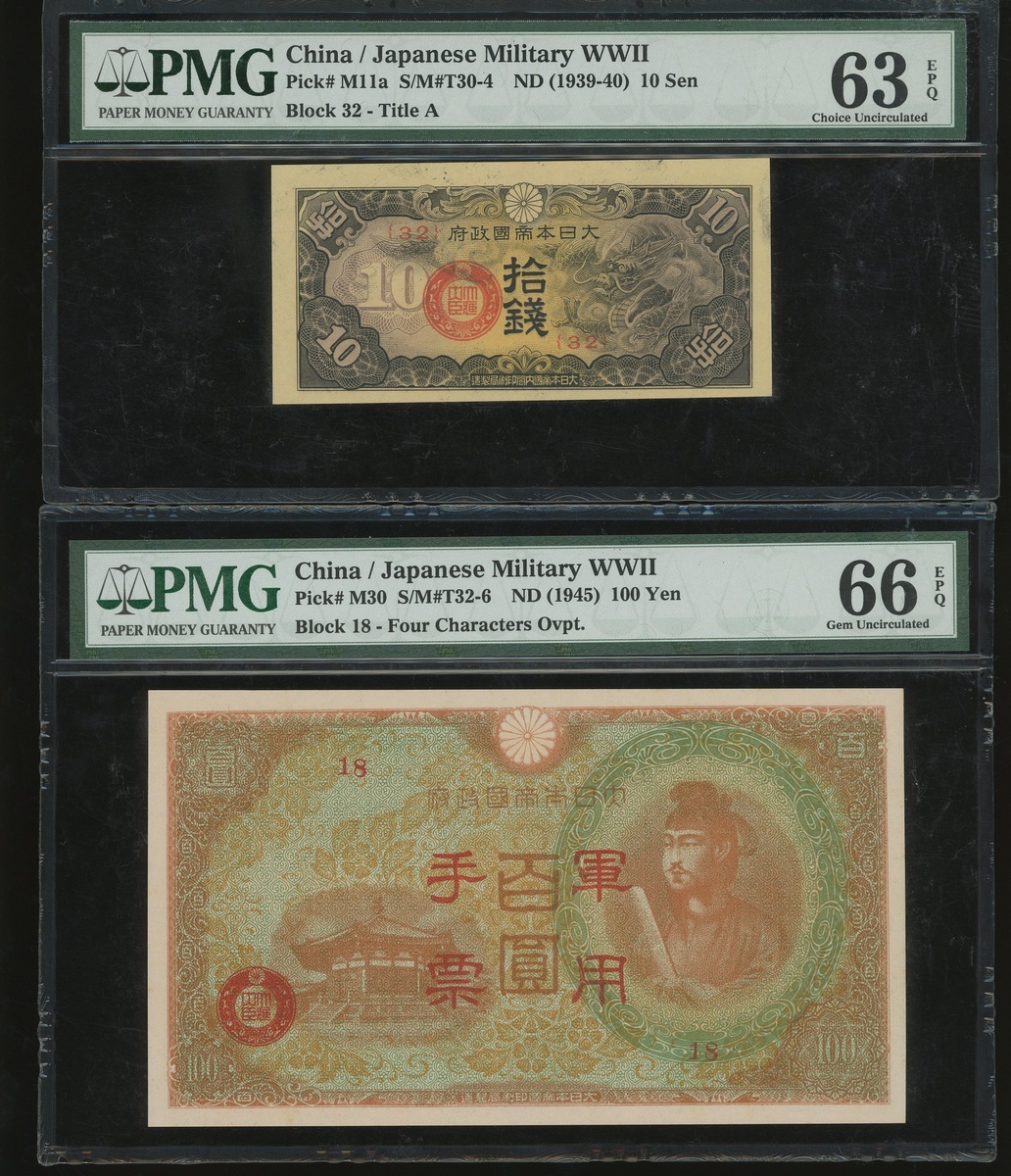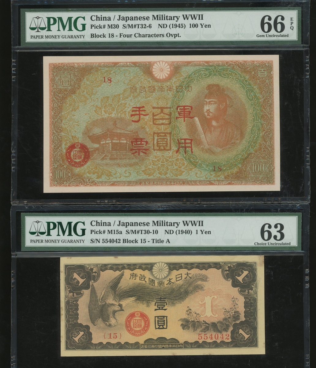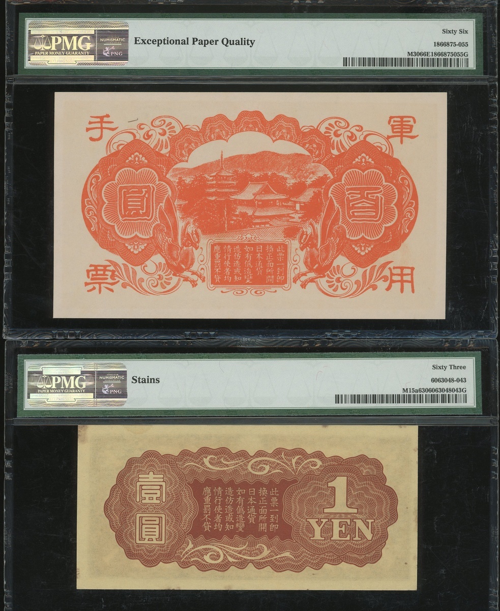 Japanese Imperial Government, a group of 5x notes, consists of 10 sen, ND(1939-40), 1 yen, ND(1940), and 100 yen(3), ND(1945), block number 32, 1, 18, 18, and 15, (Pick M11a, M15a, M21a and M30), PMG 63EPQ, 64, 66EPQ, 66EPQ and 63 respectively (5) .