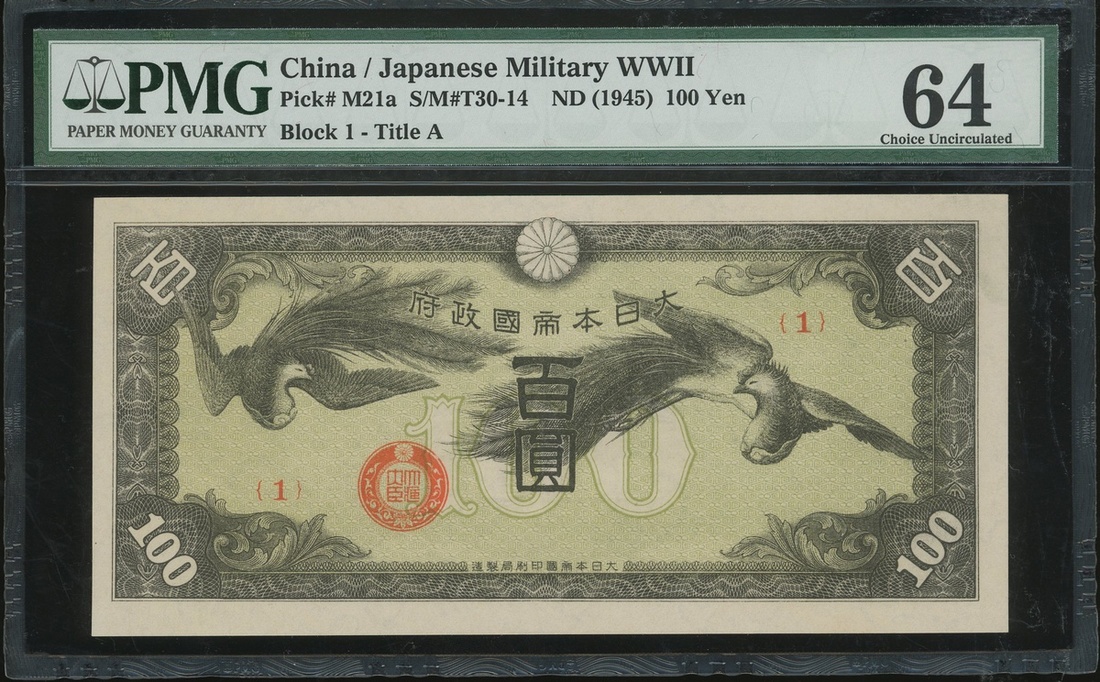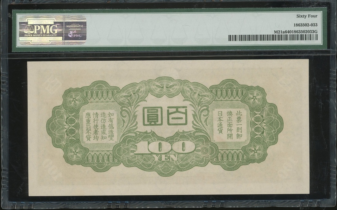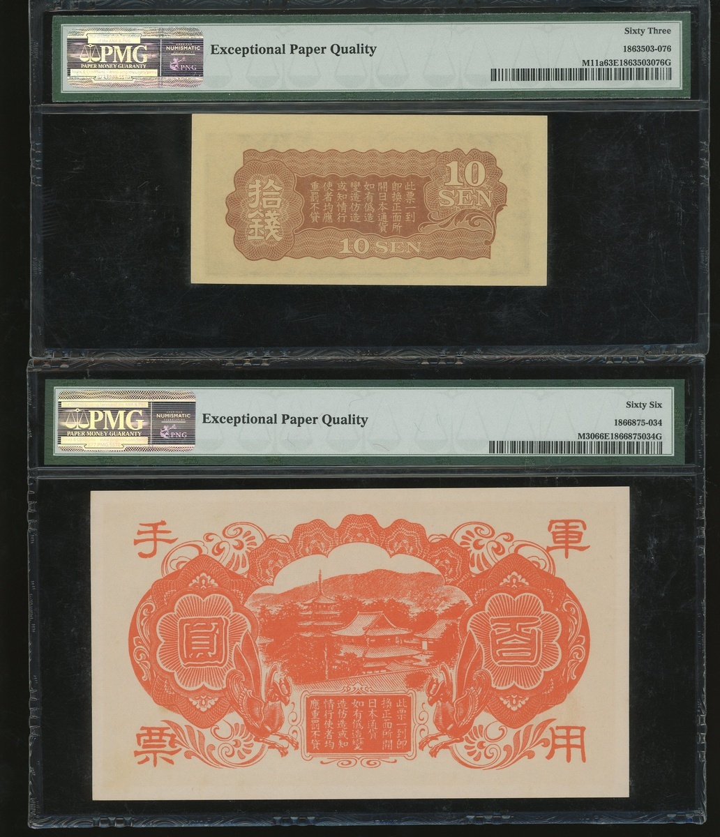 Japanese Imperial Government, a group of 5x notes, consists of 10 sen, ND(1939-40), 1 yen, ND(1940), and 100 yen(3), ND(1945), block number 32, 1, 18, 18, and 15, (Pick M11a, M15a, M21a and M30), PMG 63EPQ, 64, 66EPQ, 66EPQ and 63 respectively (5) .