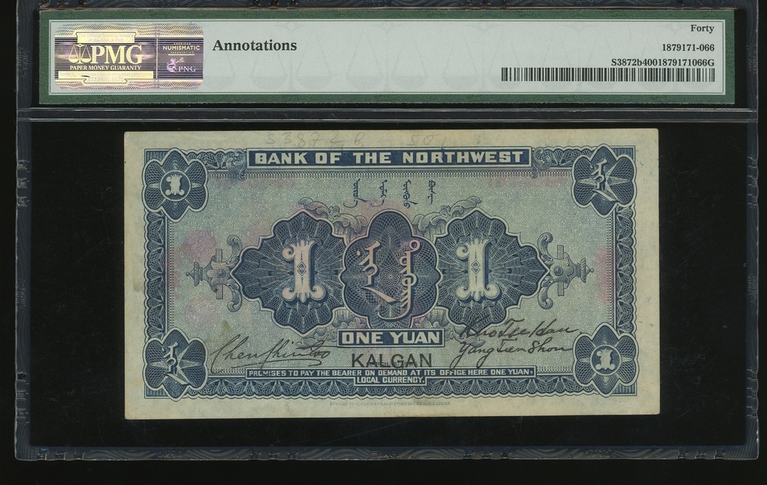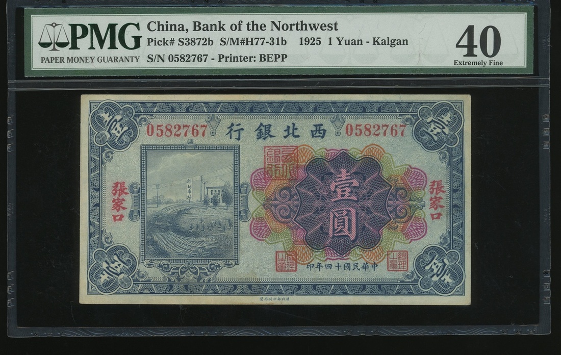Bank of Northwest, 1 yuan, Kalgan, Year 14(1925), serial number 0582767, (Pick S3872b), PMG 40 Choice Extremely Fine (Annotations).
