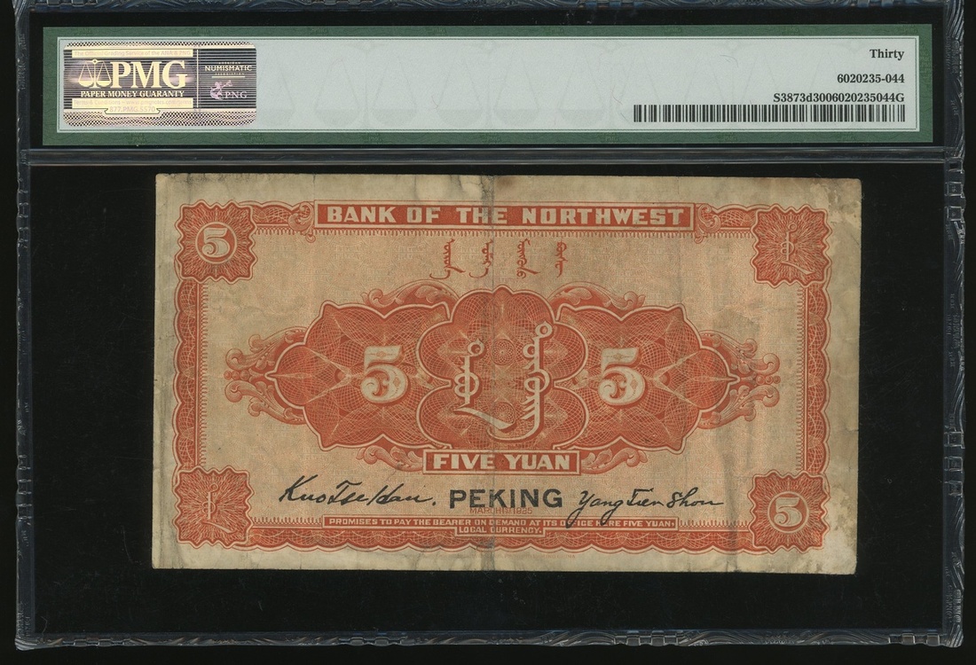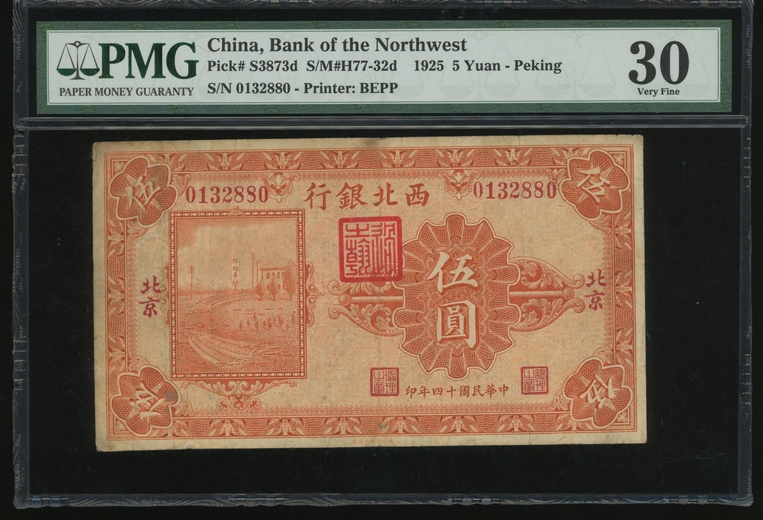Bank of Northwest, 5 yuan, Peking, Year 14(1925), serial number 0132880, (Pick S3873d), PMG 30 Very Fine.