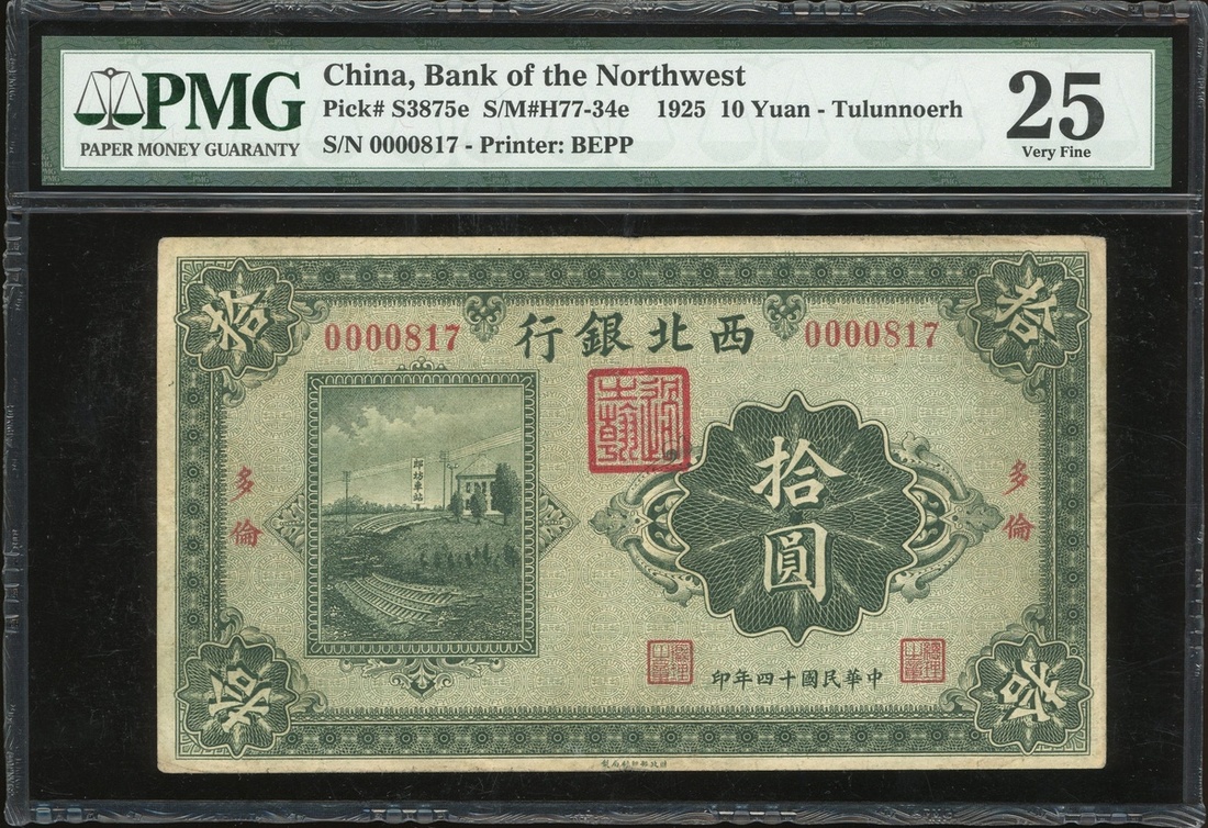 Bank of Northwest, 10 yuan, Tulunnoerh, Year 14(1925), serial number 0000817, (Pick S3875e), PMG 25 Very Fine and a low serial number too!