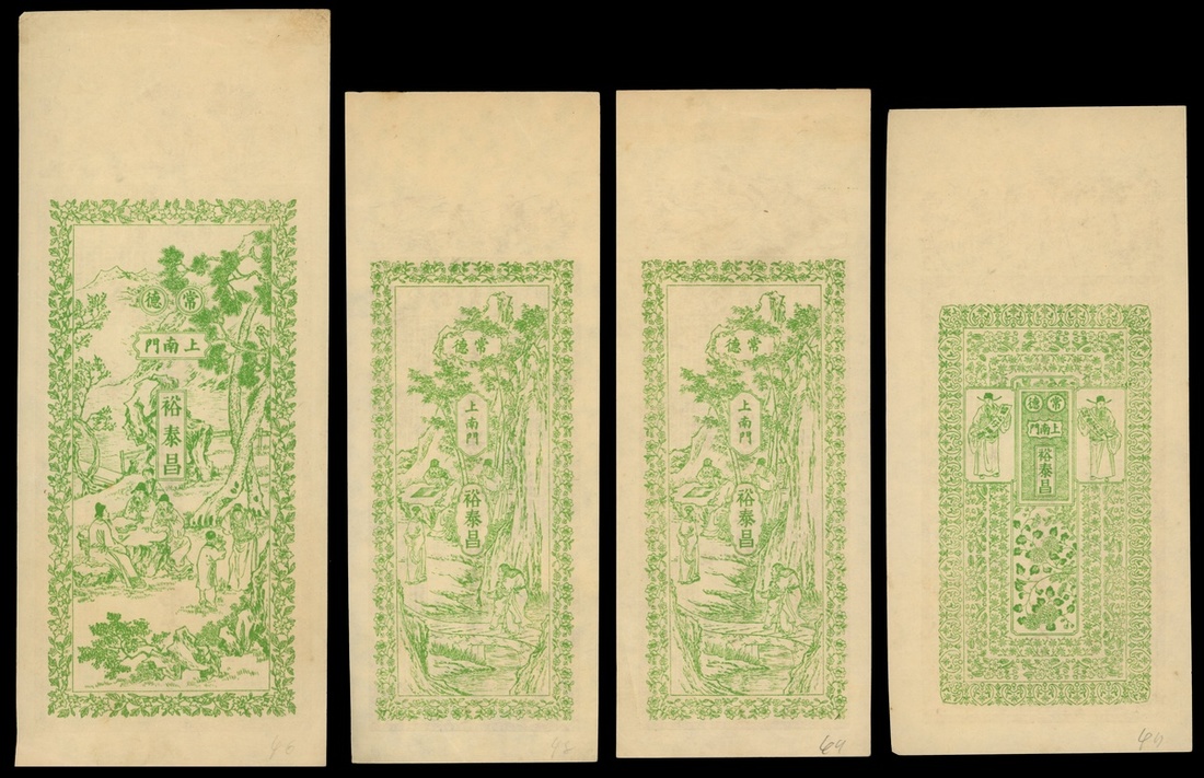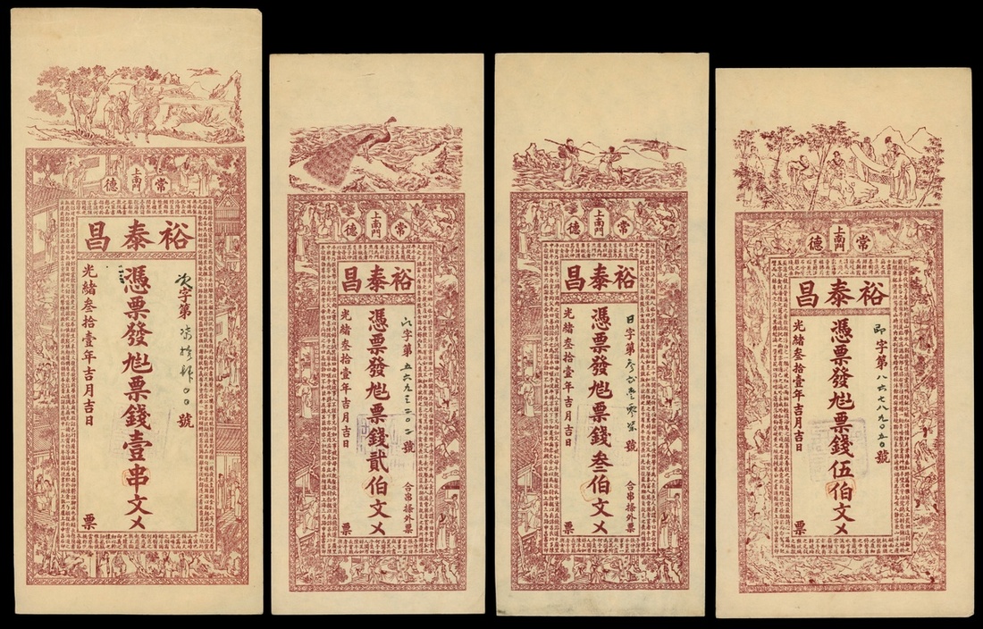 Republican Era, Private Issue, Yu Taichang, Hunan Province, a set of 200, 300, 500 cash and 1 chuan notes, Year 31 of Guangxu(1905), vertical format, brown on obverse, reverse green, traditional Chinese figures and stories in border, immortal figures or animal at top,