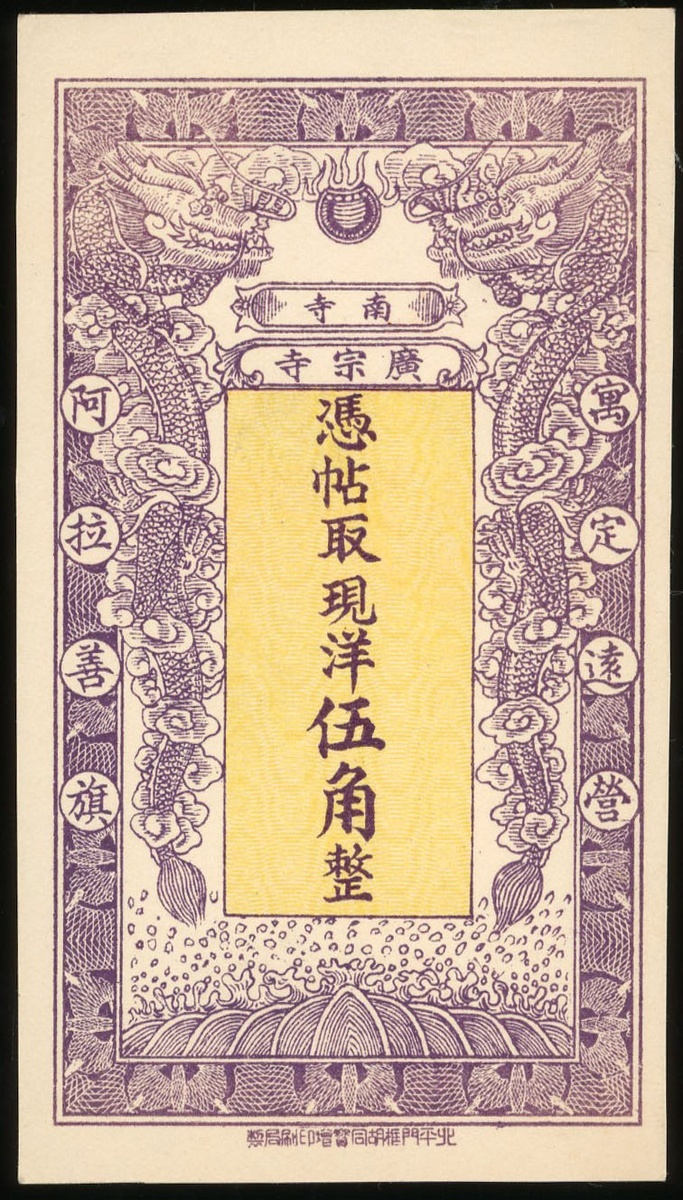 民國時期私鈔南寺廣宗寺現洋5角,直式版,UNC,輕微軟折