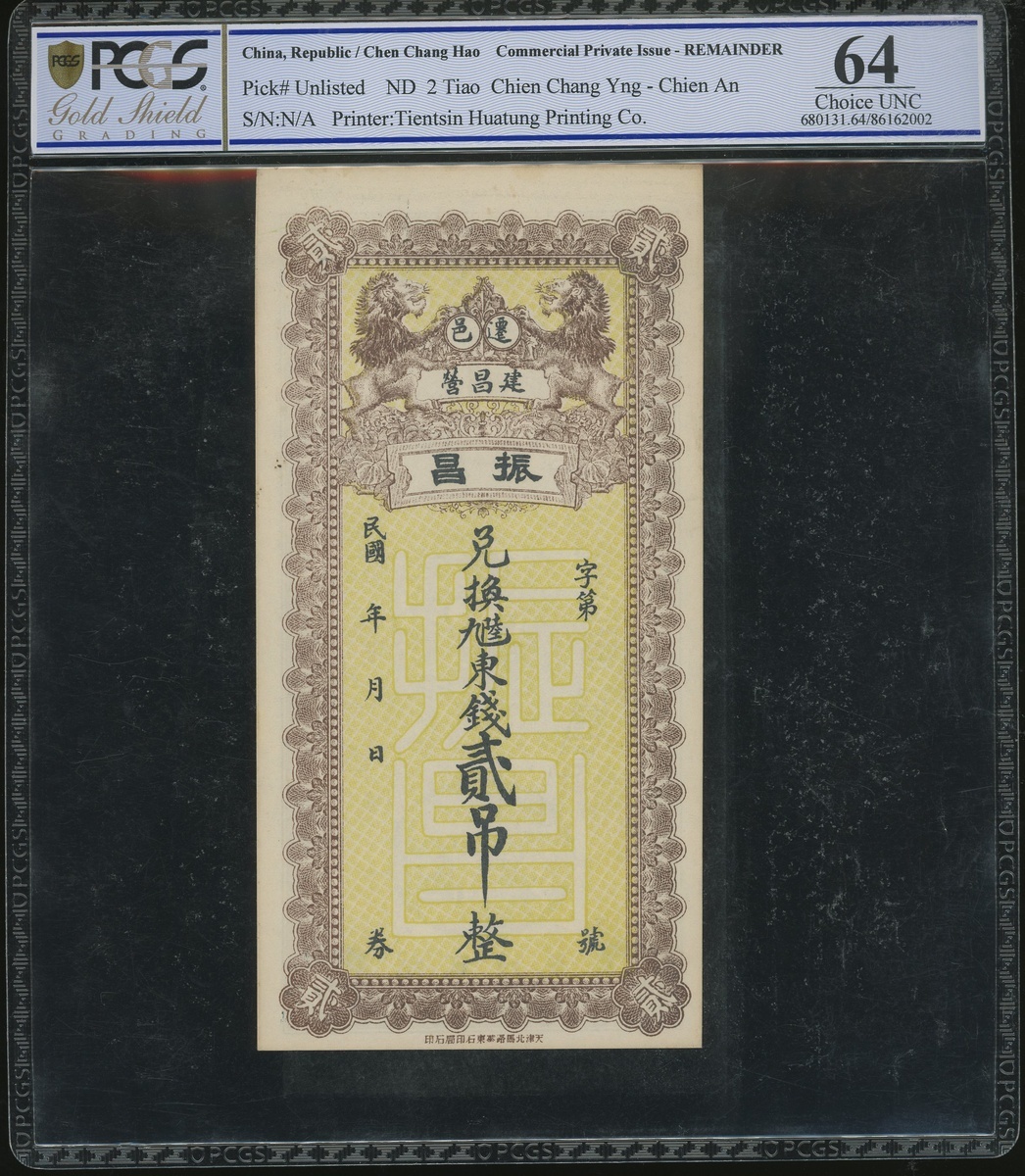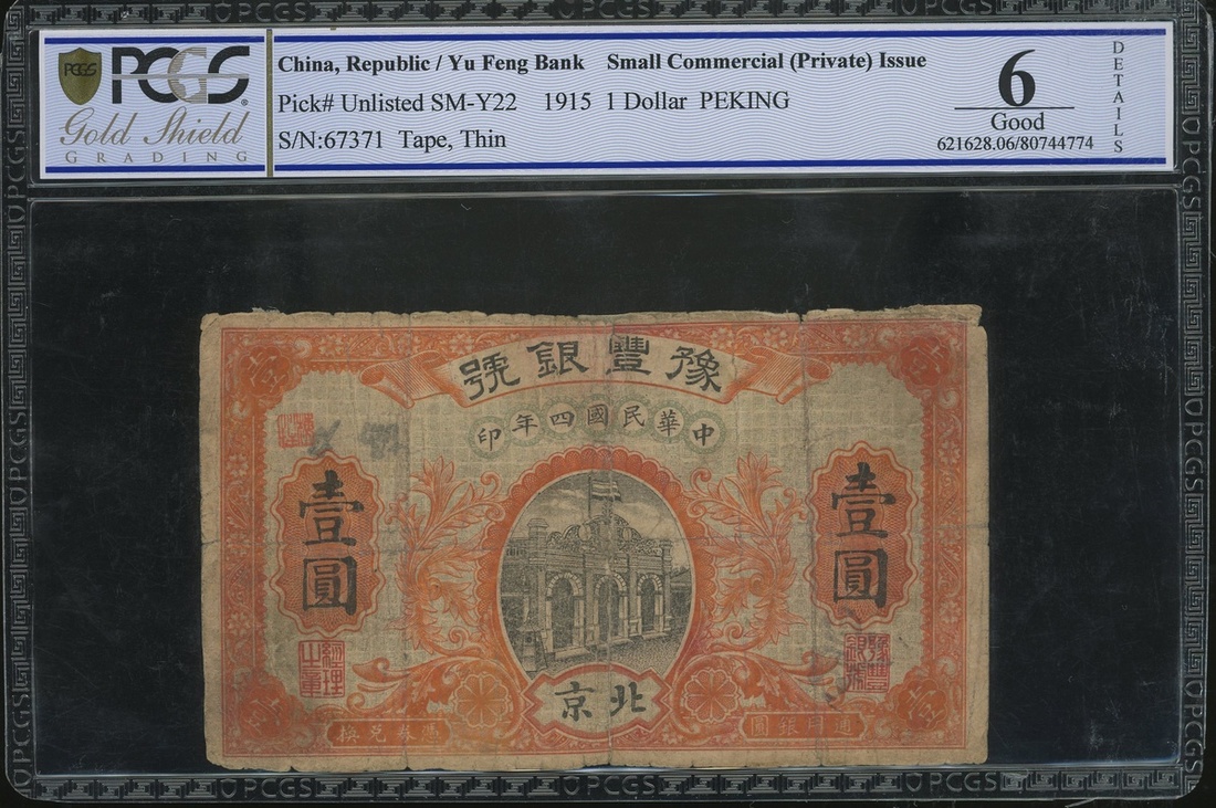 Republican China, a pair of private issue, Yu Feng Bank, $1, Peking, Year 4(1915), 67371, and Chen Chang Hao, Chien Chang Yng, 2 tiao, Chien An, 2 tiao printed by Tientsin Huatung Printing Co., (Pick unlisted), graded PCGS Gold Shield Grading 6 Details (Tape, Thin) and 64 respectively (2) .