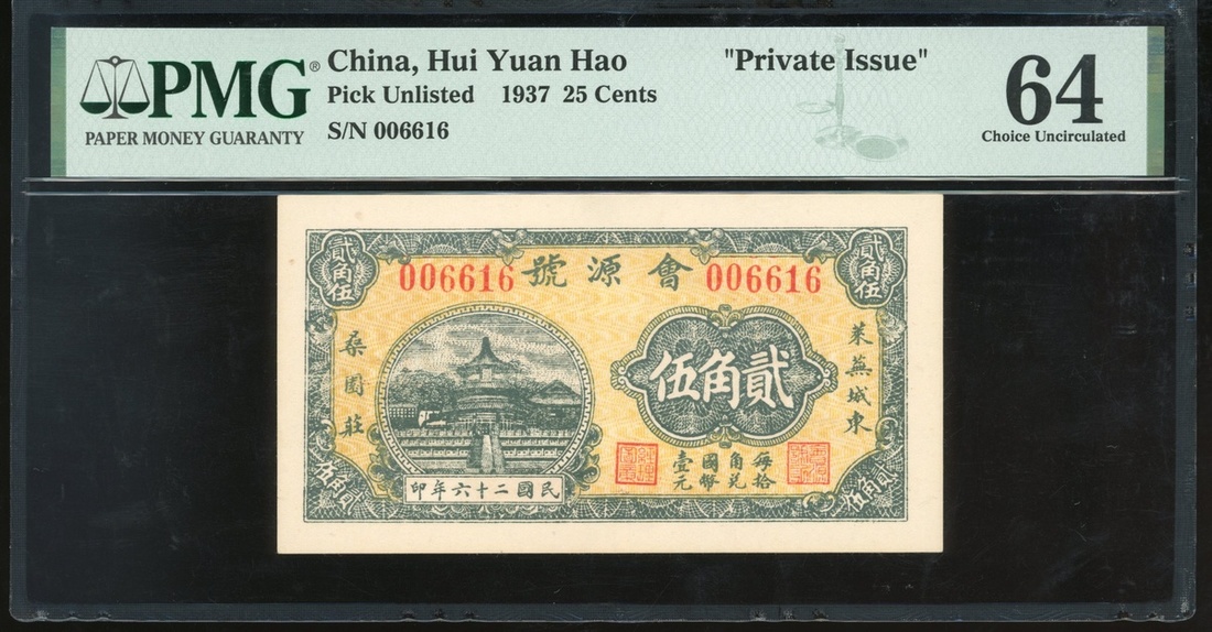 Republican Period, Private Issue, 'Hui Yuan Hao', 25 chiao, 1937, serial number 006616, (Pick unlisted), PMG 64 Choice Uncirculated