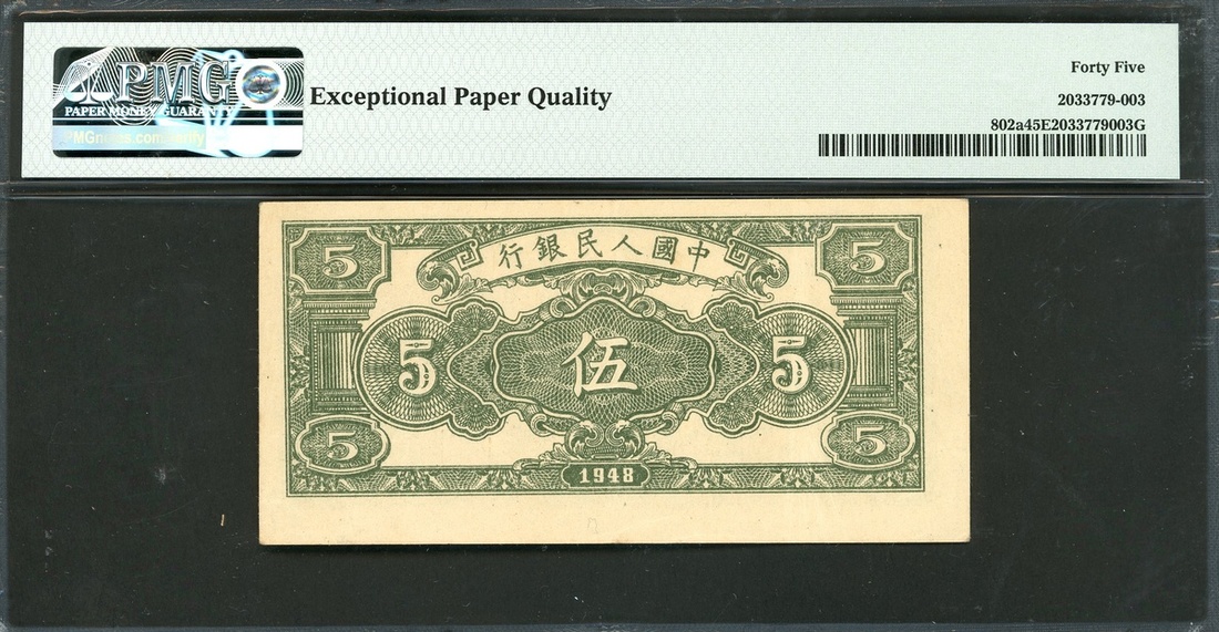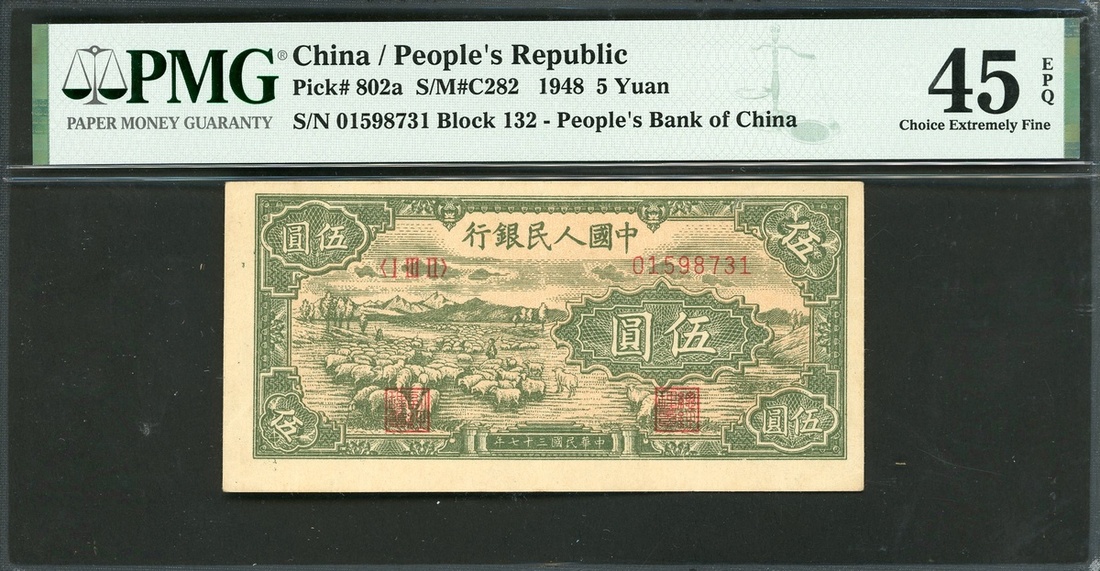 1948年中國人民銀行第一版人民幣5元「牧羊」,編號I III II 01598731,PMG 45EPQ