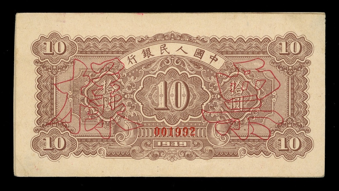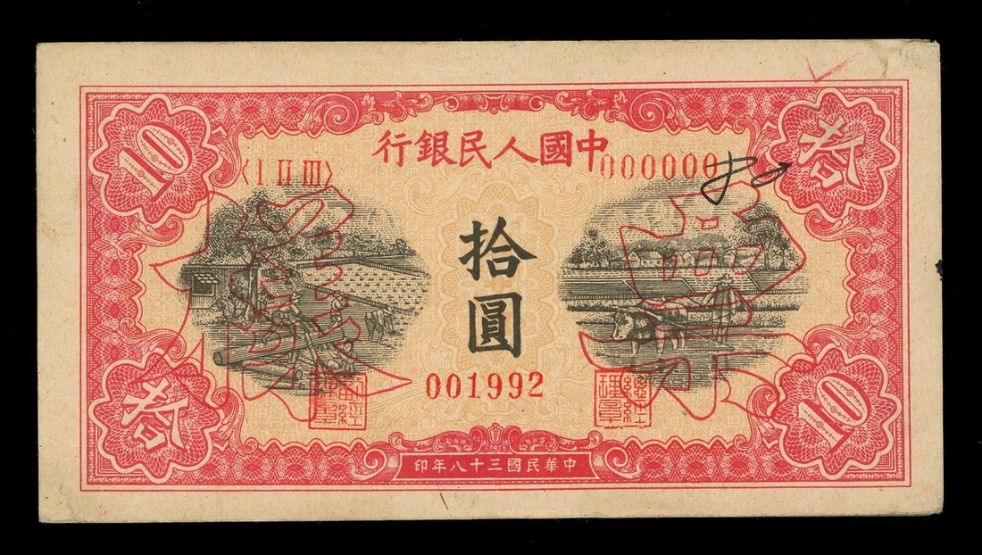 People's Bank of China, 1st series renminbi, 1949, 10 yuan, uniface obverse and reverse specimens, 'Woodsawing and Ploughin', control number 001992,