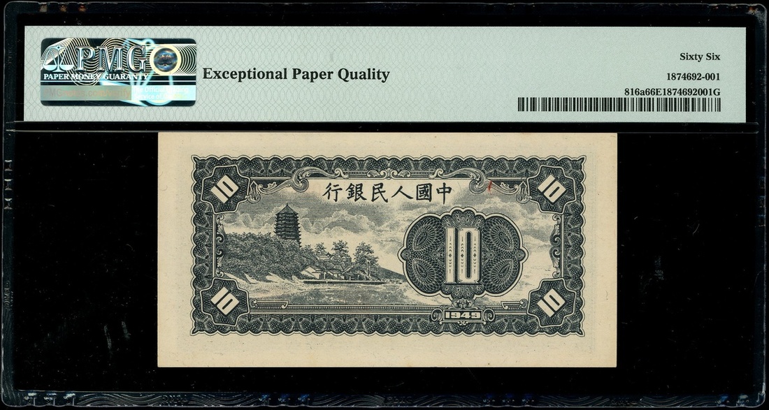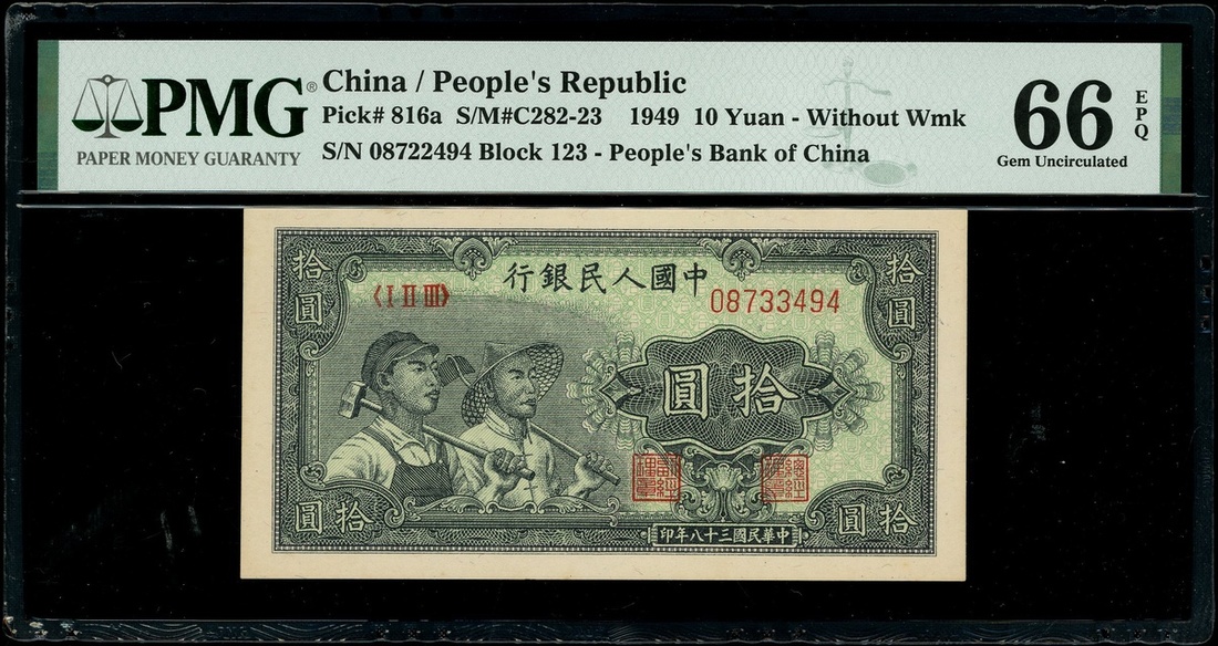 1949年中國人民銀行第一版人民幣10元「工農」,編號I II III 08733494,PMG 66EPQ