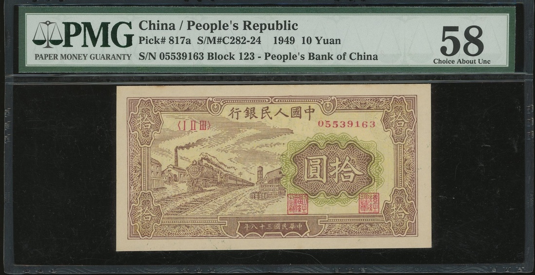 1949年中國人民銀行第一版人民幣10元「黃火車」,編號I II III 05539163,PMG 58