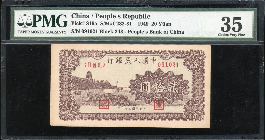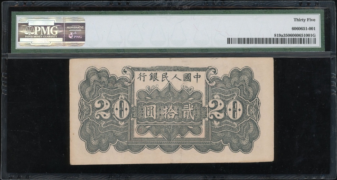 1949年中國人民銀行第一版人民幣20元「棕六和塔」,編號II IV III 091021,PMG35