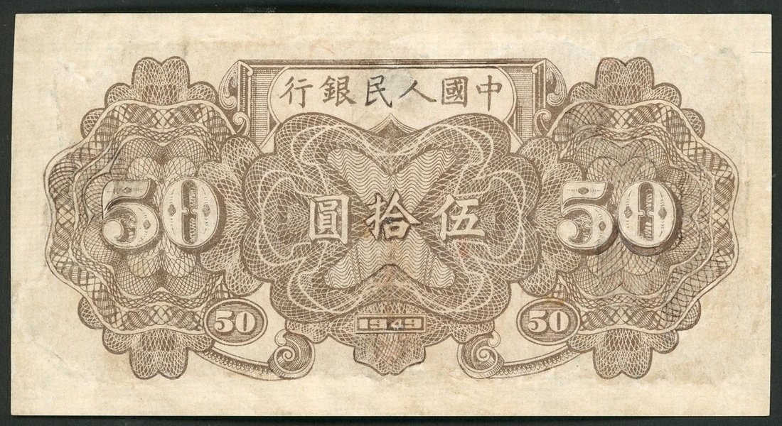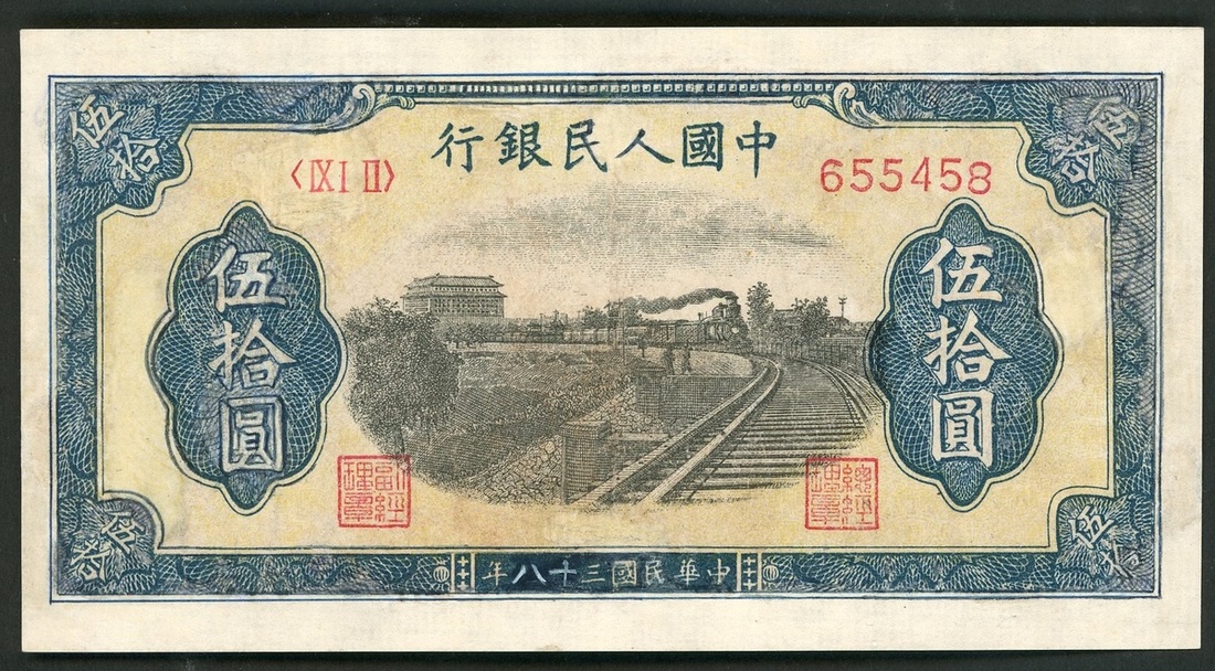 People's Bank of China, 1st series renminbi, 1949, 50 Yuan, 'Train', serial number IX I II 655458, the scarce 6 digit serial number variety,