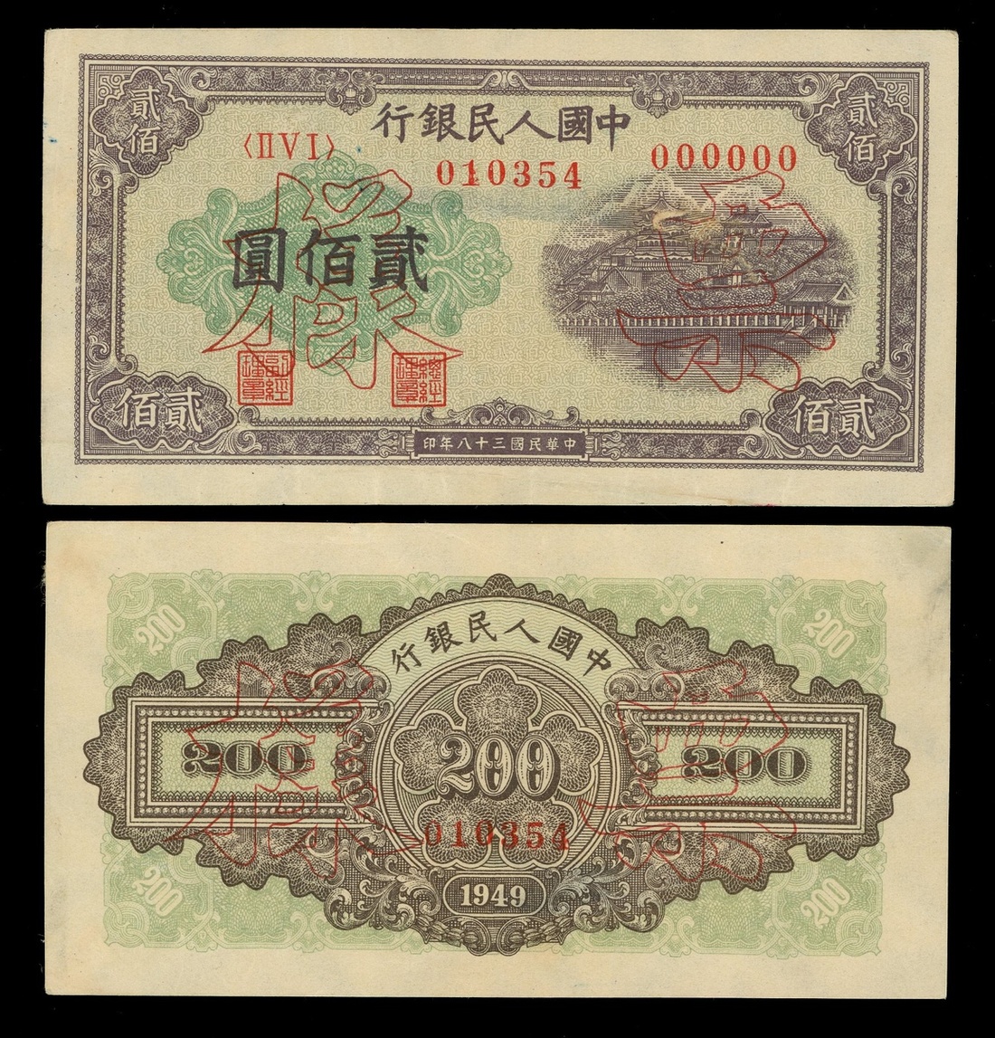 1949年中國人民銀行第一版人民幣200元「排雲殿」正反面單面樣票一對,控號010354,AEF品相,有黏貼痕跡,紙身因撕開而有微裂及揭薄現象