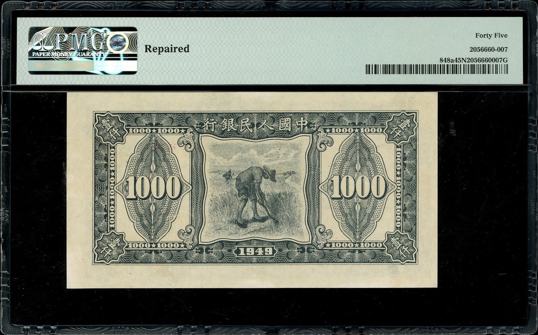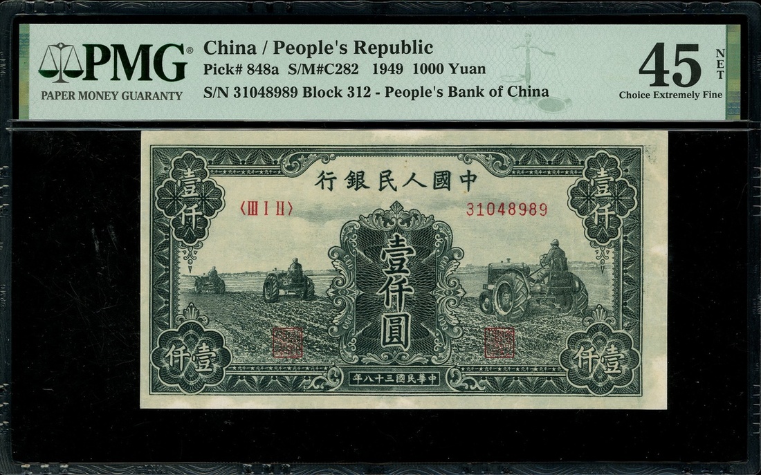1949年中國人民銀行第一版人民幣1000元「拖拉機」,編號III I II 31048989,PMG 45NET,有修補