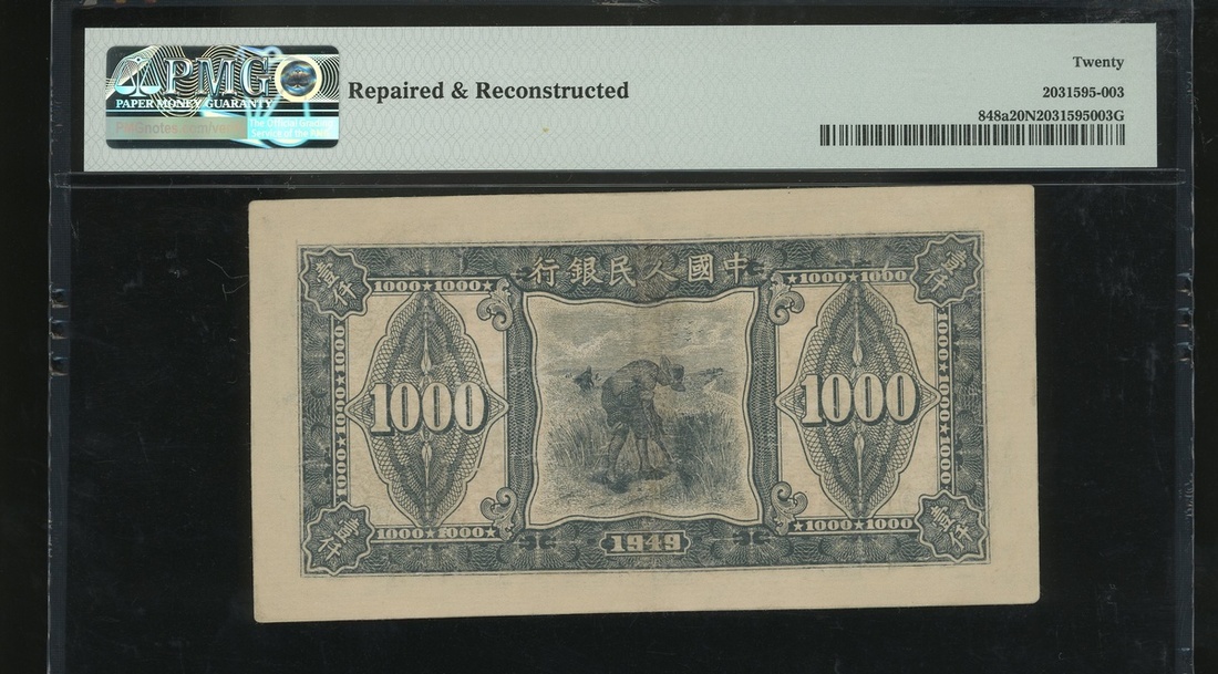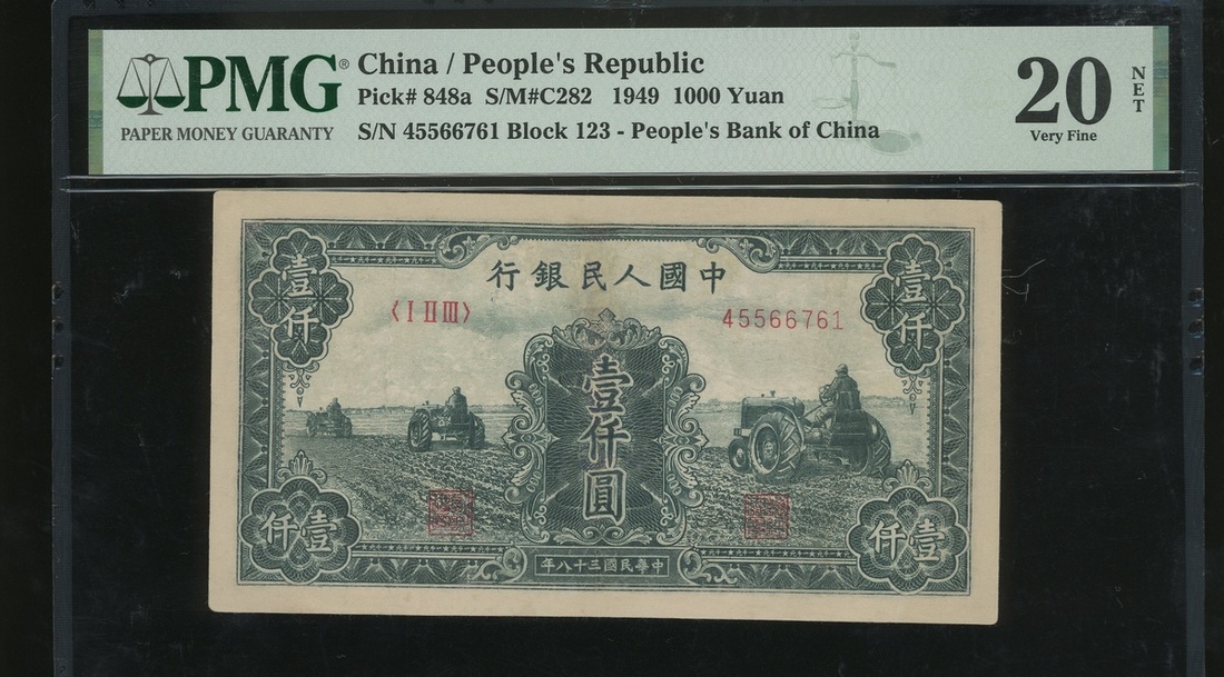 1949年中國人民銀行第一版人民幣1000元「拖拉機」,編號I II III 4556761,PMG 20NET,有修補