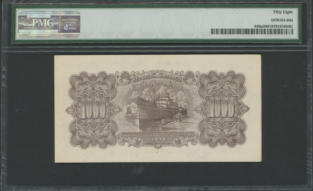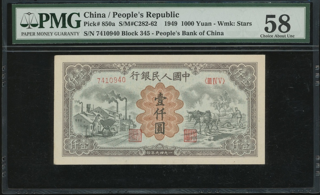 1949年中國人民銀行第一版人民幣1000元「礦車與驢子」,編號III IV V 7410940,PMG 58