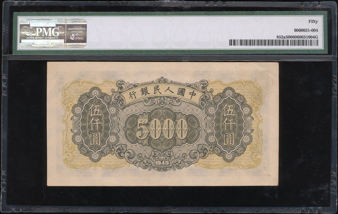 1949年中國人民銀行第一版人民幣5000元「三拖與工廠」,編號II IV III 55940727,PMG 50