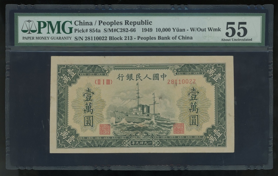 1949年中國人民銀行第一版人民幣10,000元「軍艦」,編號II I III 28110022,PMG 55
