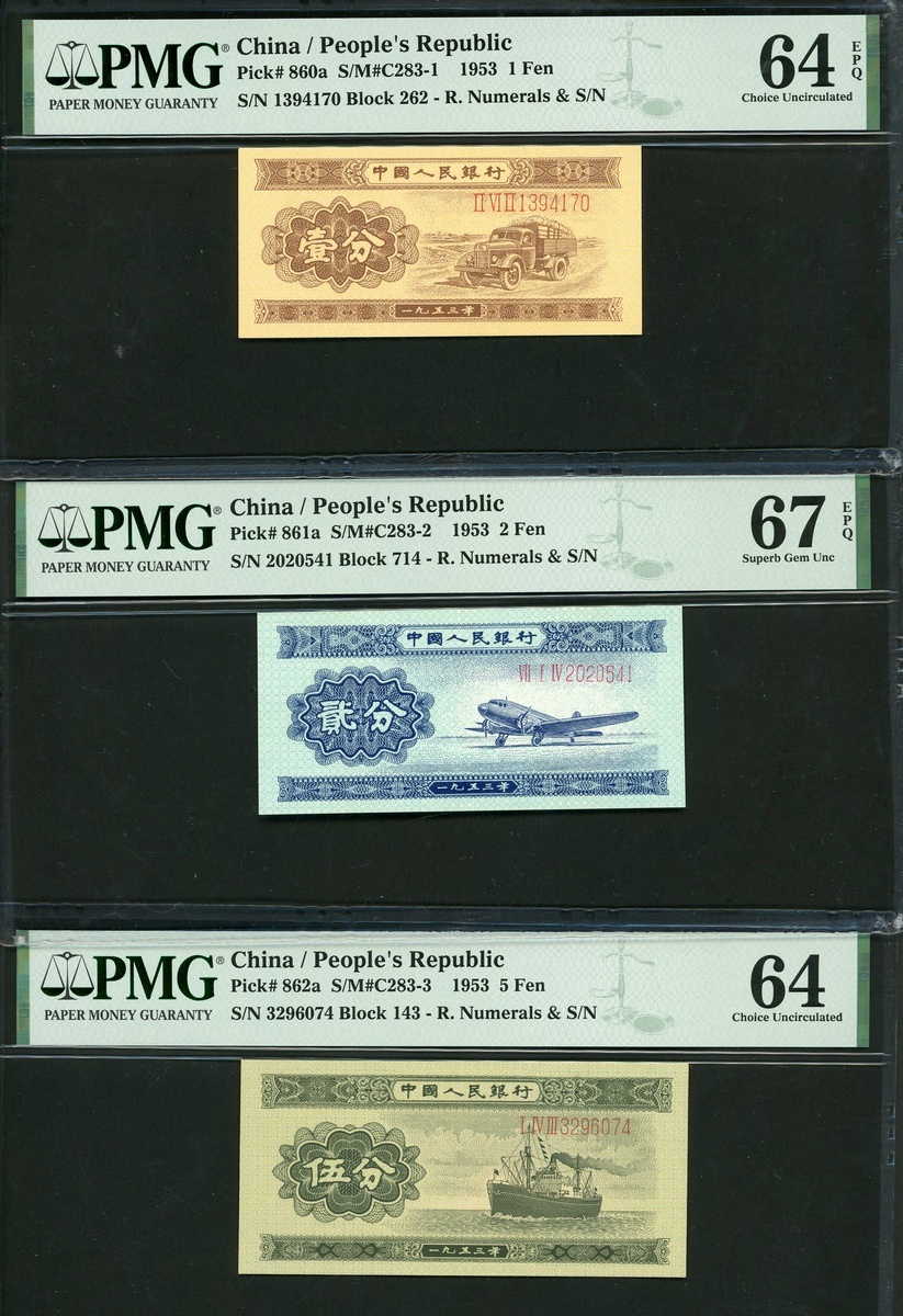1953年中國人民銀行第二版人民幣1,2及5分,編號II VI II 1394170,VII I IV 2020541及I IV III 3296074,分別PMG 64EPQ,67EPQ及64