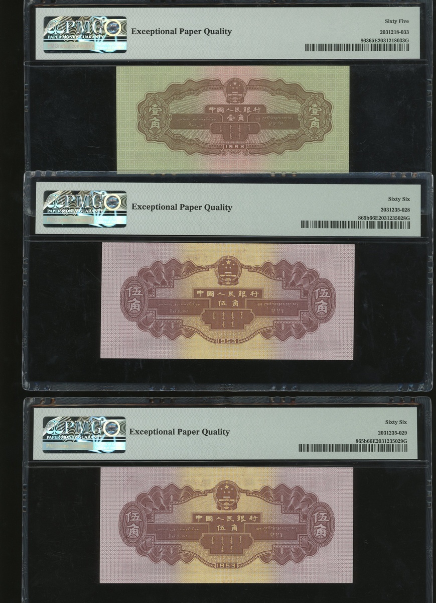 1953年中國人民銀行第二版人民幣一組三枚,分別1角一對,及5角一枚,編號X IX VIII 25848385,I VI VIII 7330710及I VI VIII 7330712,分別 PMG 65EPQ, 66EPQ 及 66EPQ
