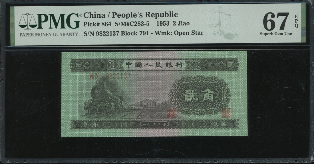 1953年中國人民銀行第二版人民幣2角,編號VII IX I 9822137,PMG 67EPQ
