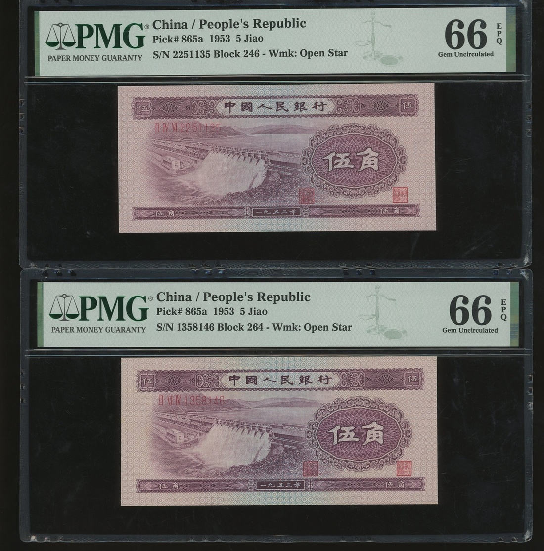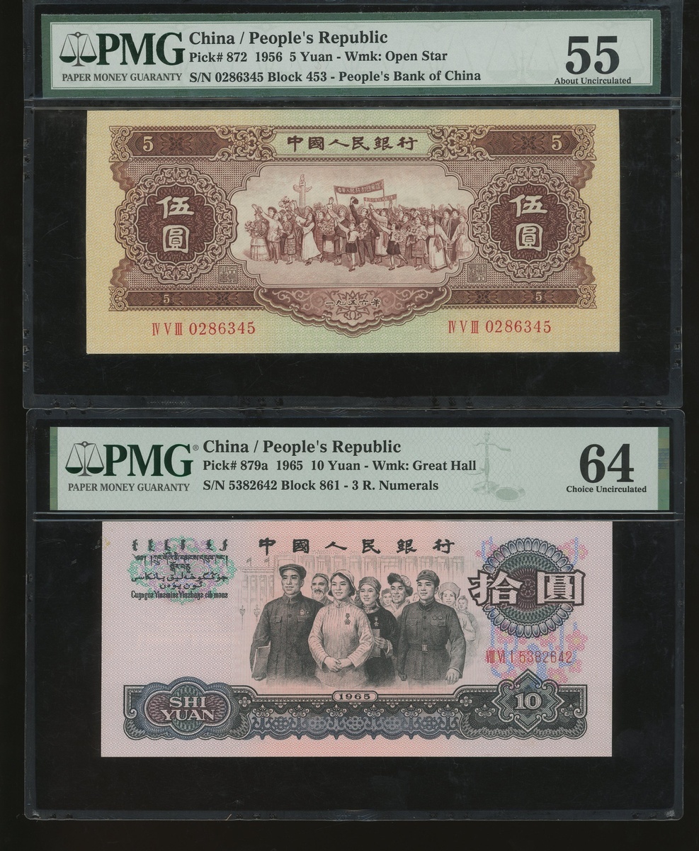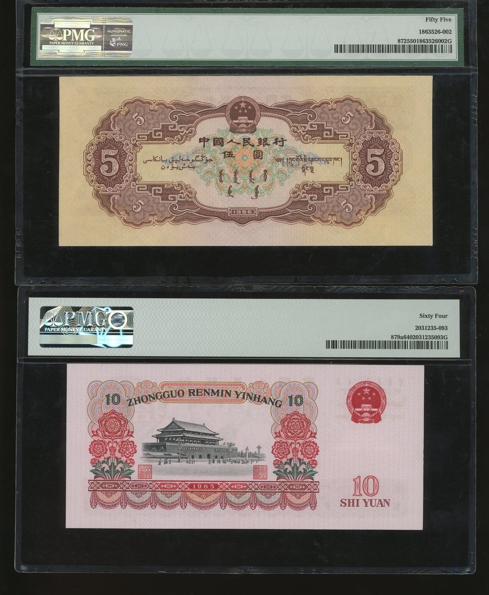 1953至1965年中國人民銀行一組四枚,包括5角一對,5元,及10元,編號II IV VI 2251135, II VI IV 1358146, IV V III 0286345 及 VIII VI I 5382642,分別PMG 66EPQ, 66EPQ, 55 及 64