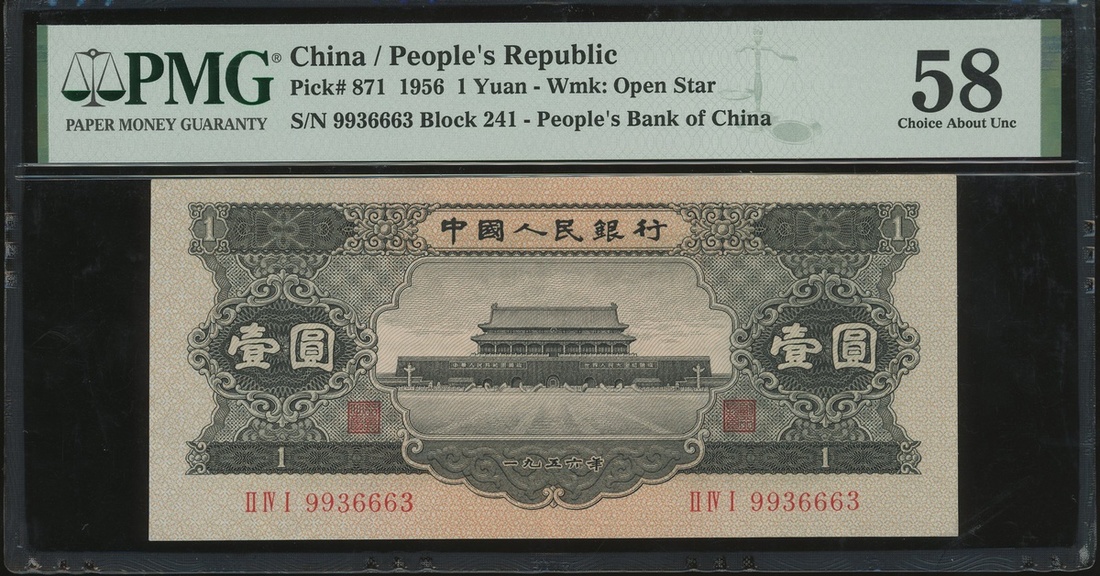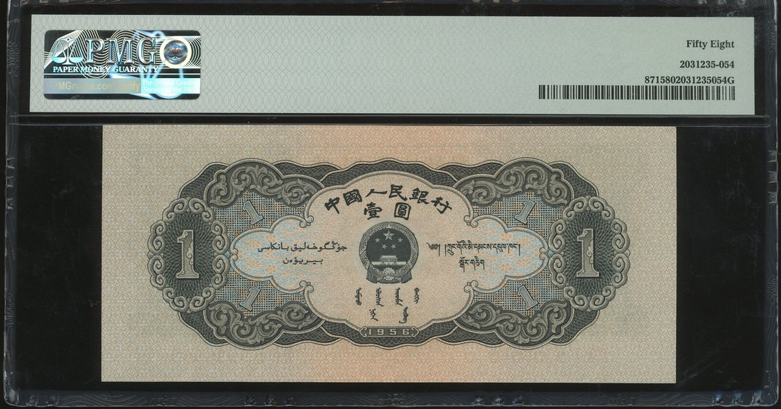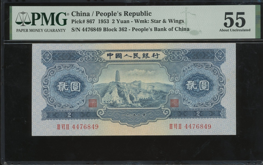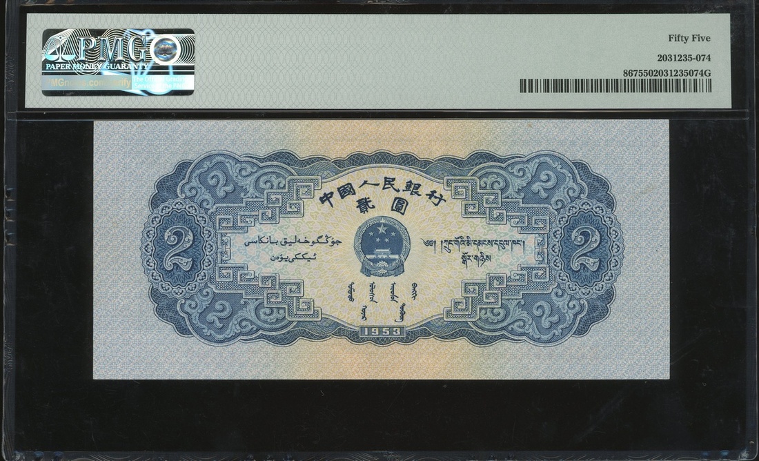 1953中國人民銀行第二版人民幣1元及2元一對,及1956年1元,共三枚,編號I VIII II 3809724, III VI II 4476849 and II IV I 9936663,分別PMG 55(微裂),55及58
