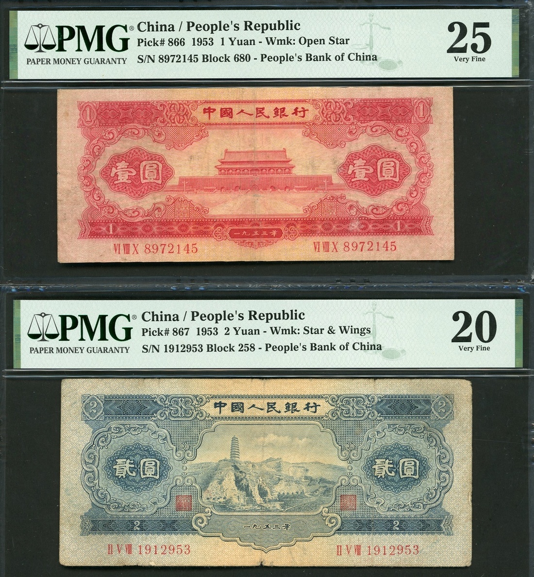1953年中國人民銀行第二版人民幣1元及2元,編號 VI VIII X 8972145及II V VIII 1912953,分別評PMG 25(帶輕微外附物)及20