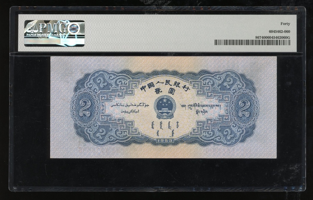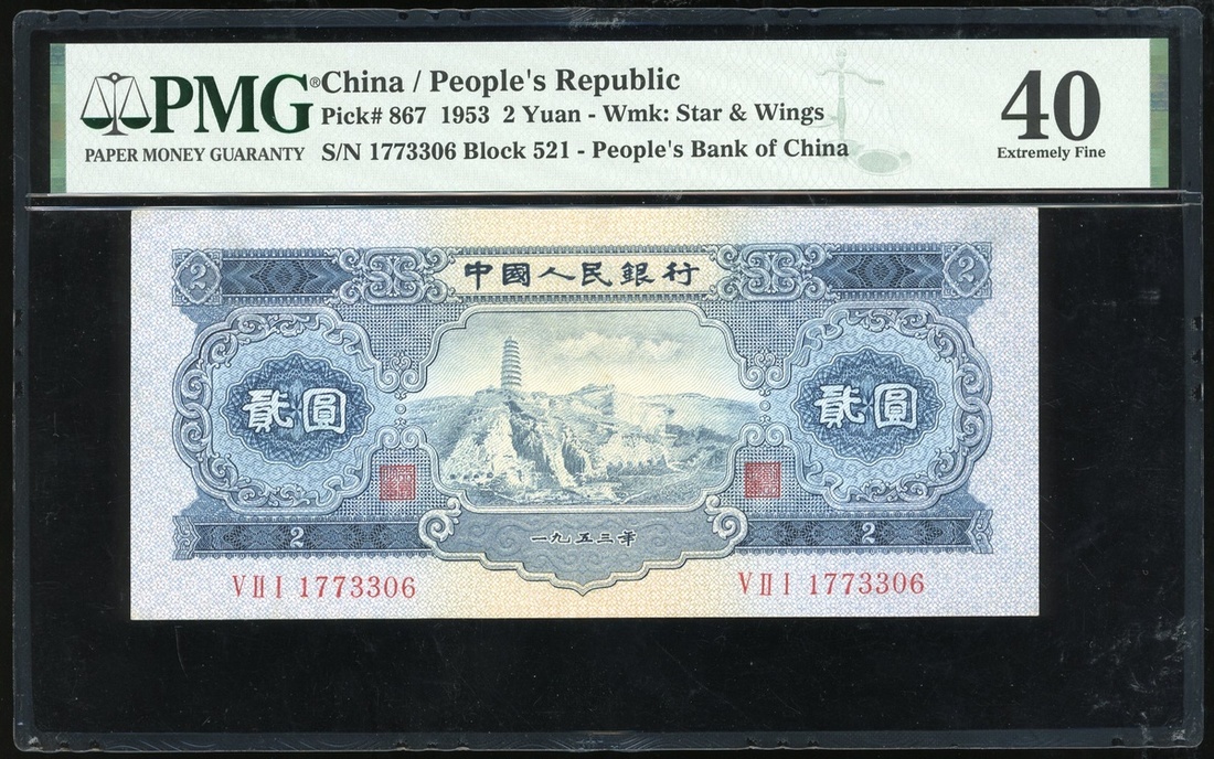 1953年中國人民銀行第二版人民幣2元,星與翼水印,編號V II I 1773306,PMG 40