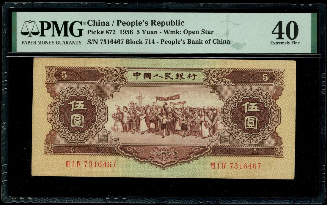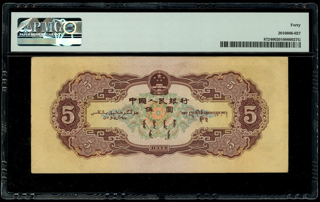 1956年中國人民銀行第二版人民幣5元,星水印,編號VII I IV 7316467,PMG 40