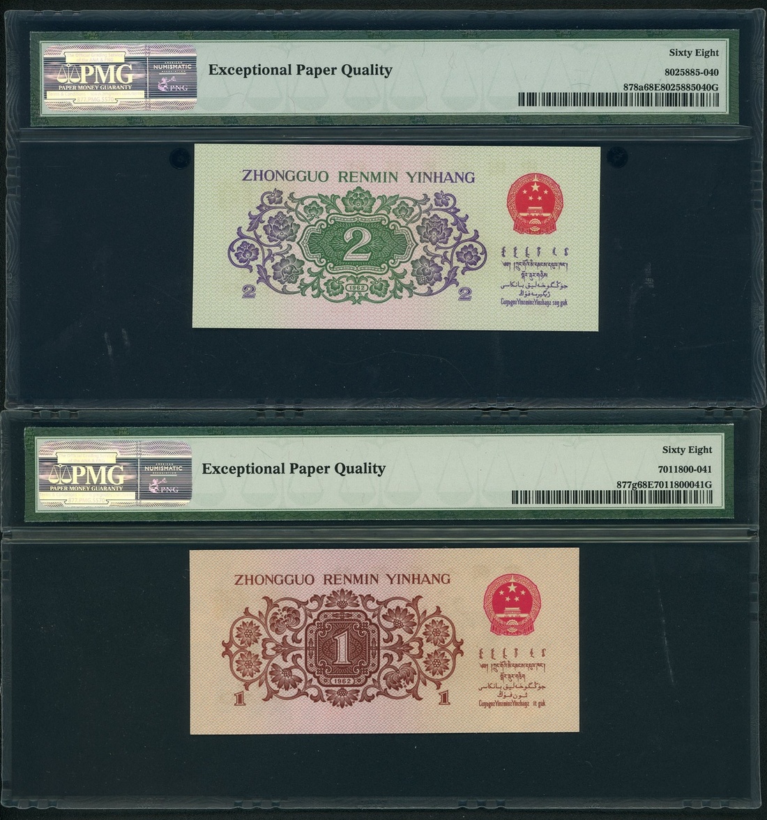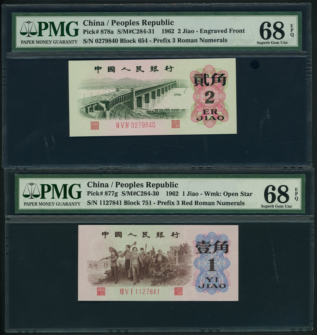 1962年中國人民銀行第三版人民幣1角及2角,編號VII V I 1127841 及 VI V IV 0279840 ,均PMG 68EPQ