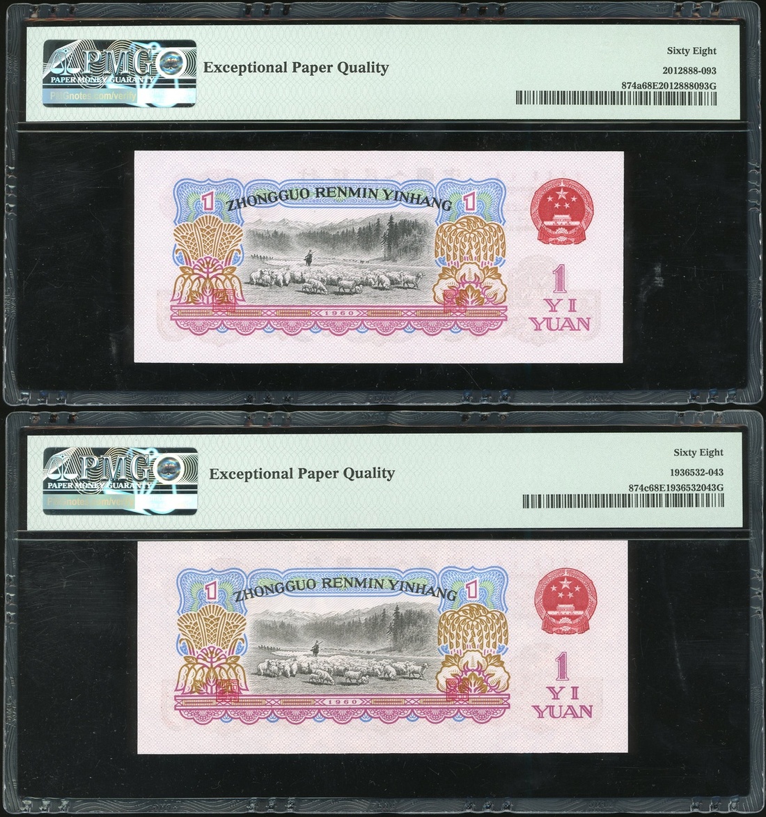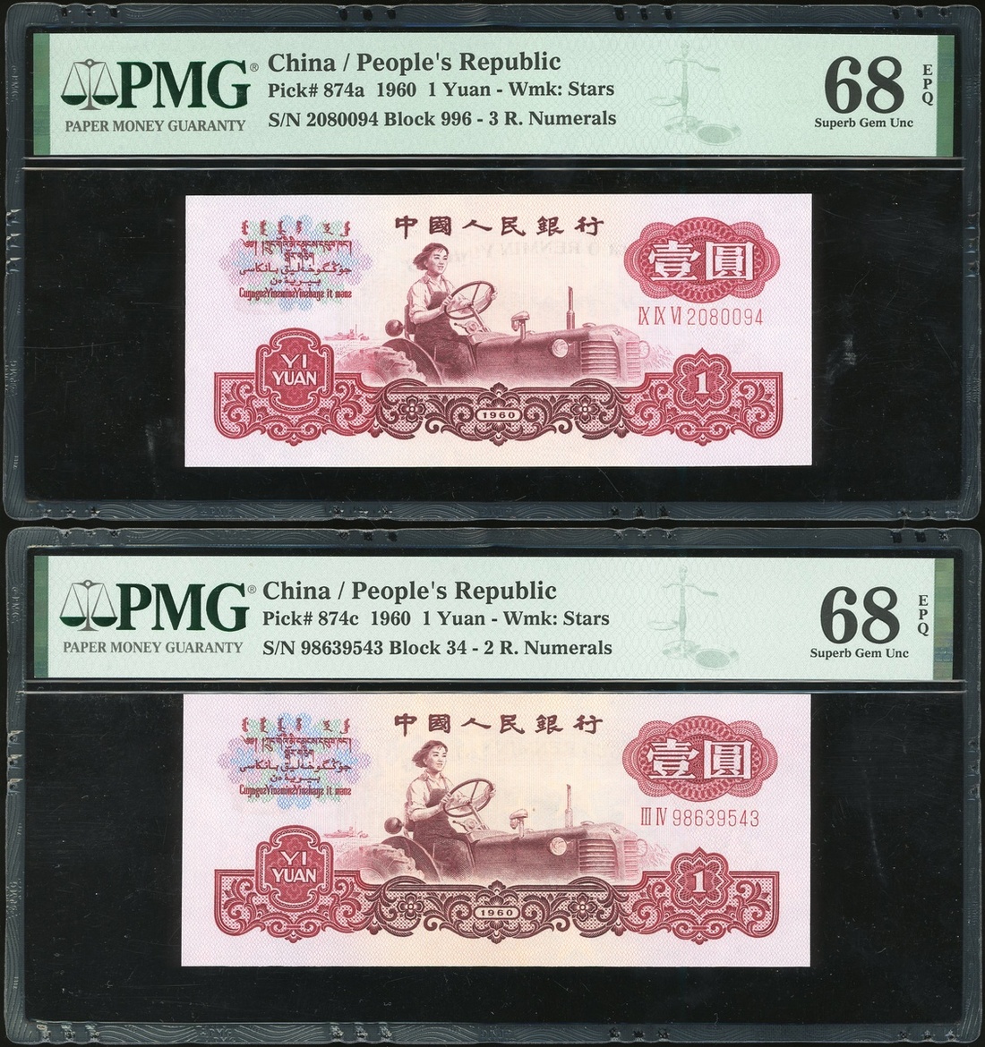 1960年中國人民銀行第三版人民幣1元一對,編號IX IX VI 2080094 及 III IV 98639543,均PMG 68EPQ