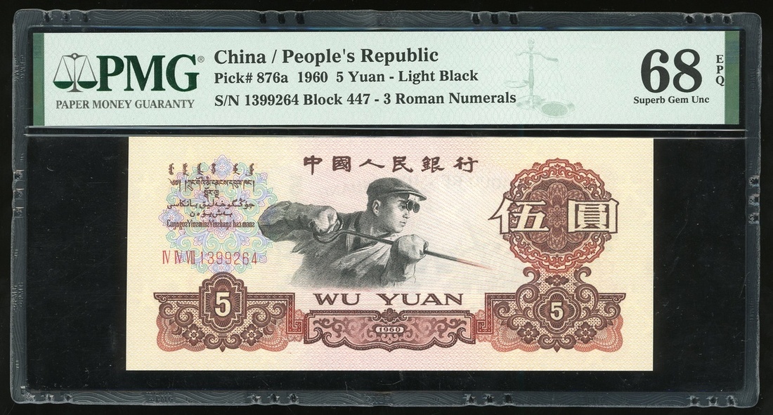 People's Bank of China, 5 yuan, 1960, serial number IV IV VII 1399264, (Pick 876a), PMG 68EPQ Superb Gem Uncirculated