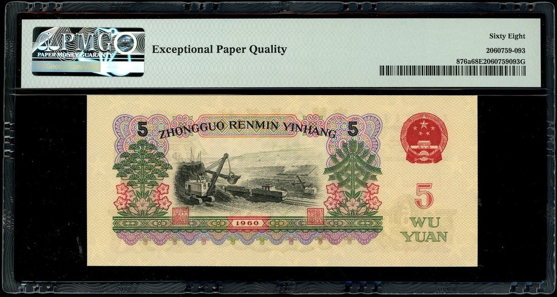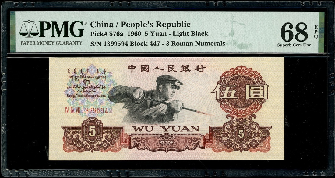 1960年中國人民銀行第三版人民幣5元,淺黑色,編號IV IV VII 1399594,PMG 68EPQ