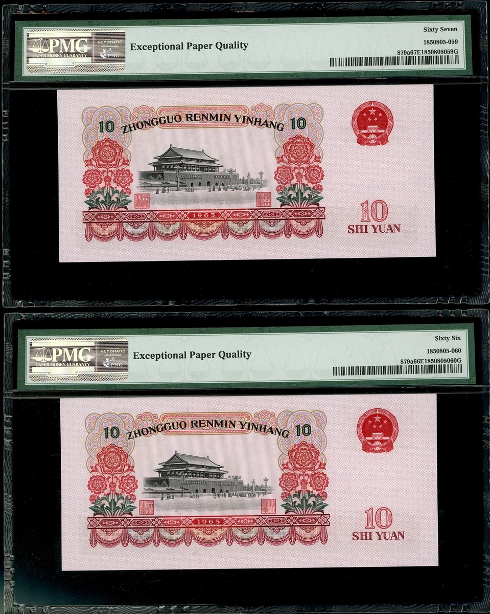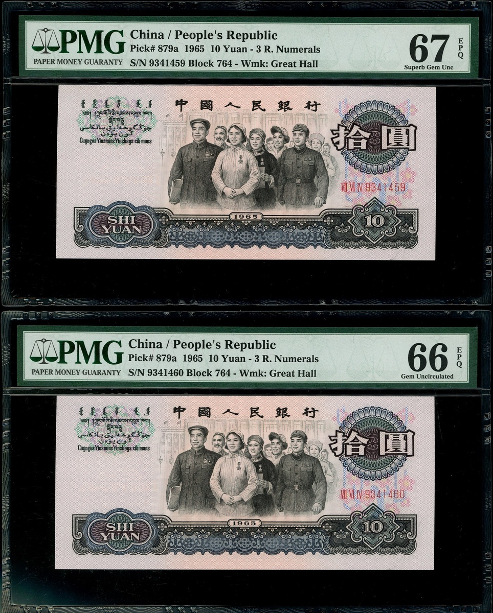 1960年中國人民銀行第三版人民幣10元連號一對,編號VII VI IV 9341459-460,分別PMG 67EPQ 及 66EPQ