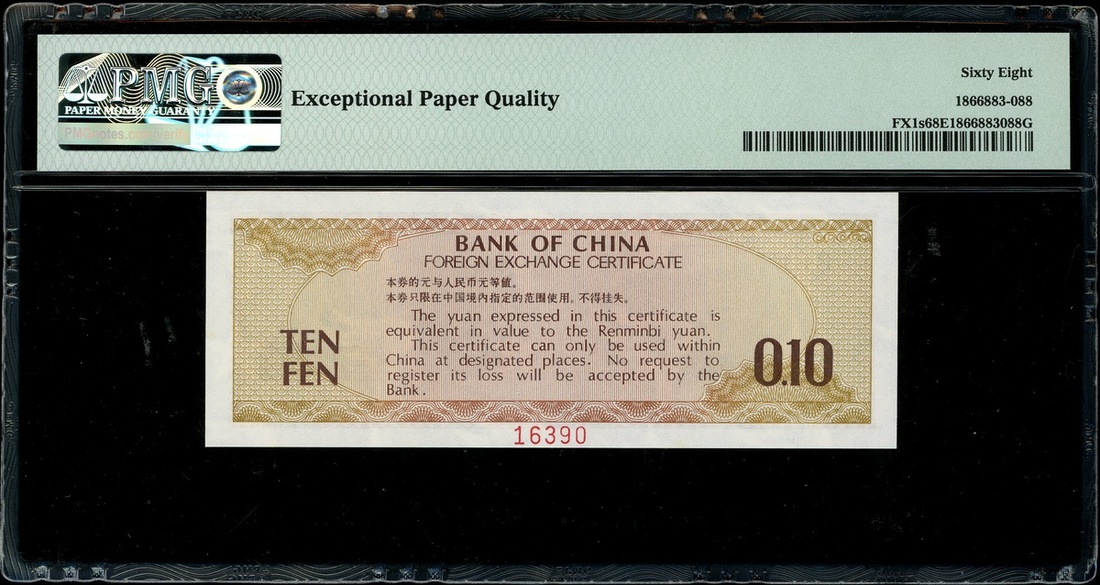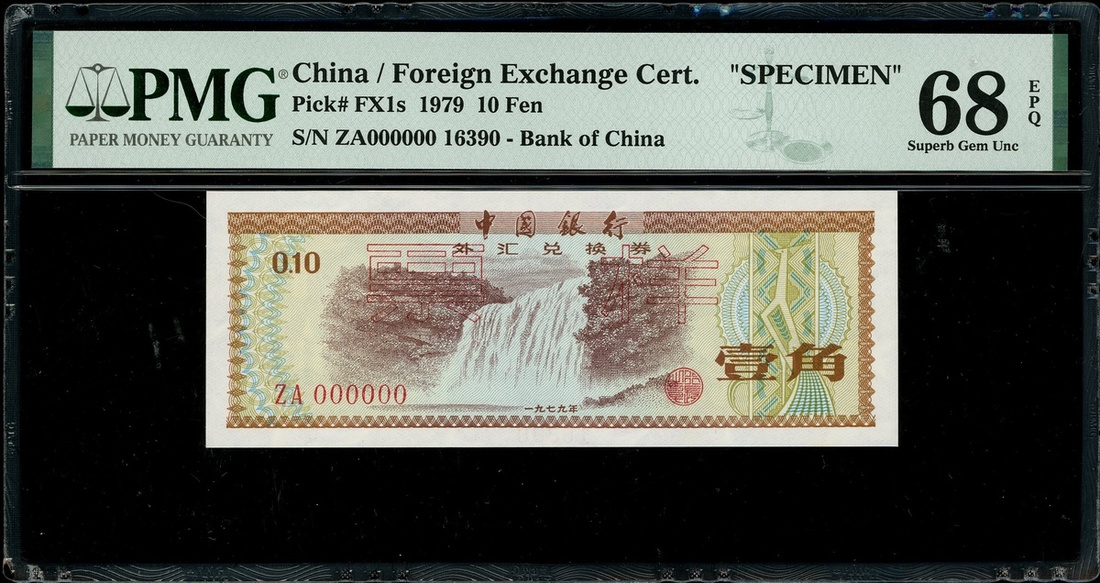 Bank of China, Foregin Exchange Certificate, 10 fen, SPECIMEN, 1979, serial number ZA000000 control number 16390, (Pick FX1s), PMG 68EPQ Superb Gem Uncirculated.