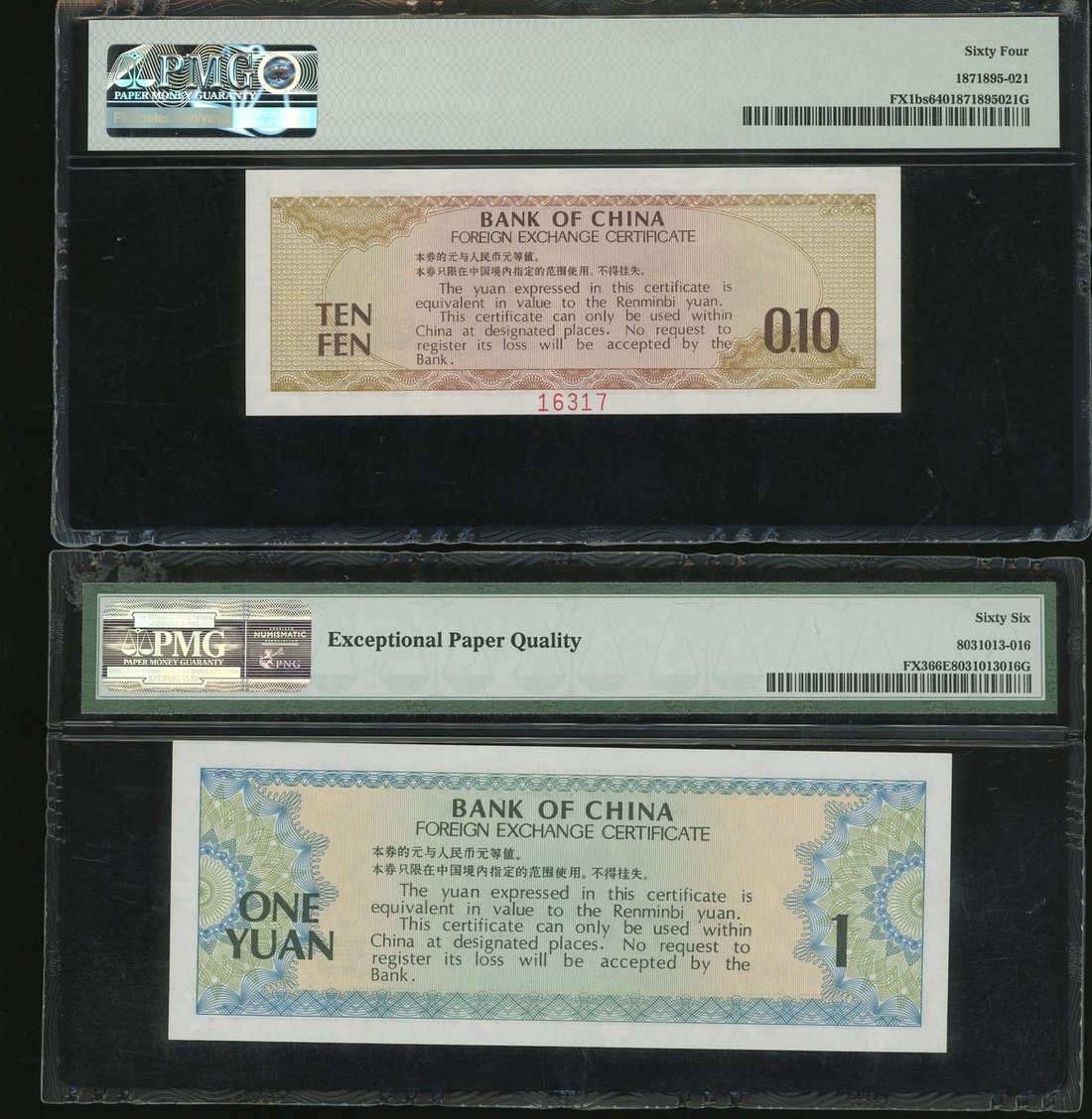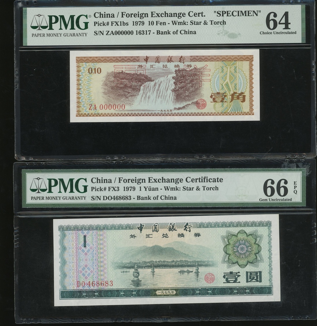 Bank of China, Foreign Exchange Certificate, a pair of 10 fen and 1 yuan, 1979, serial numbers DO468683 and ZA000000 16317, (Pick FX1bs and FX3), graded PMG 64 and 66EPQ respectively (2) .