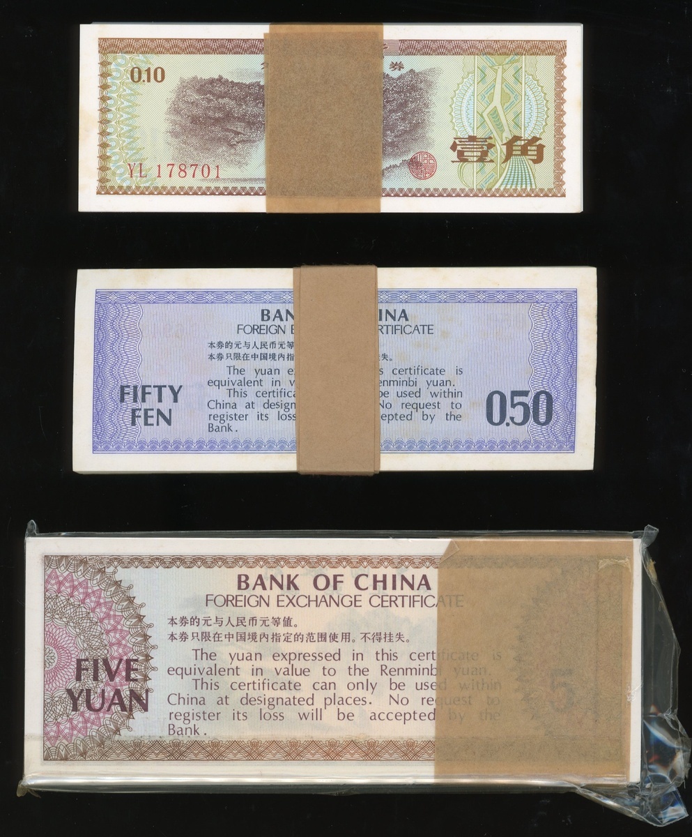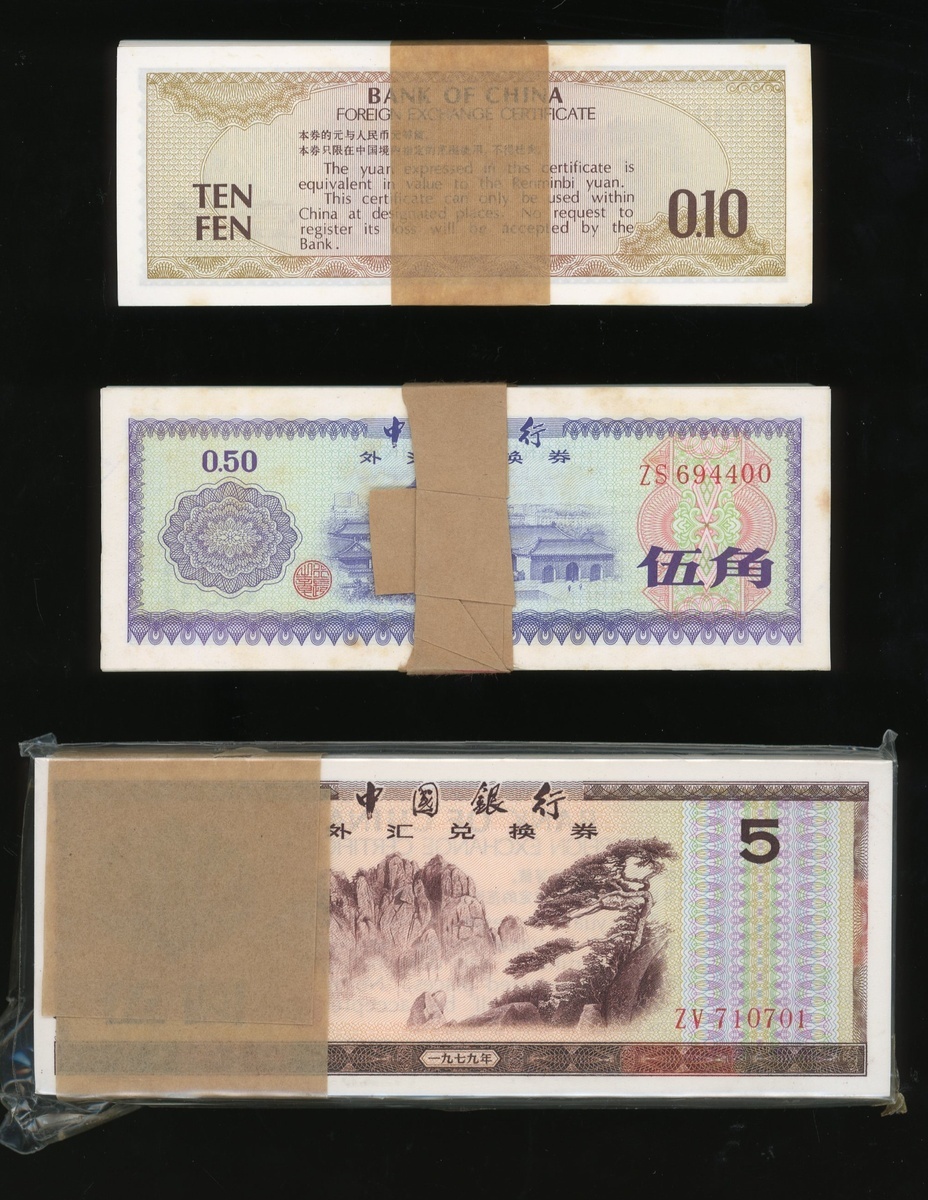 Bank of China: Foreign Exchange Certificates, 1 jiao, 5 jiao and 5 Yuan, 1979, each in bundles of 100x consecutive notes, serial numbers YL 178701-800, ZS 694391-400 and ZV 710701-800, (FX1, 2, 4), uncirculated, some with edge creases (300)